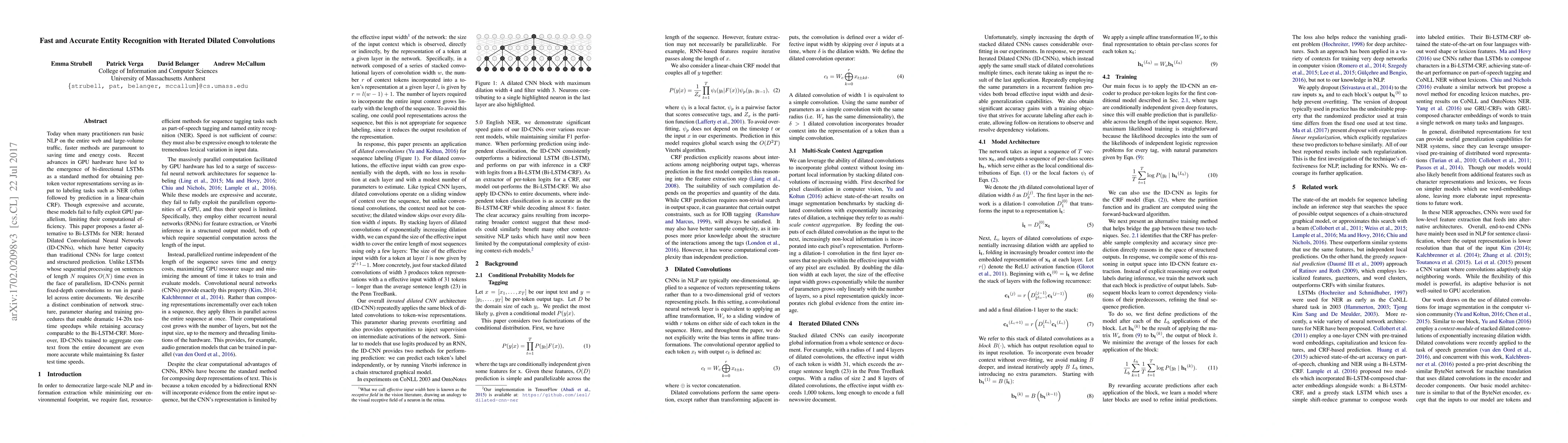 This paper proposes Iterated Dilated Convolutional Neural Networks (ID-CNNs) as a faster alternative for Named Entity Recognition (NER) compared to bi-directional LSTMs, achieving 14-20x speedups while maintaining comparable accuracy, and even higher accuracy with full document context.