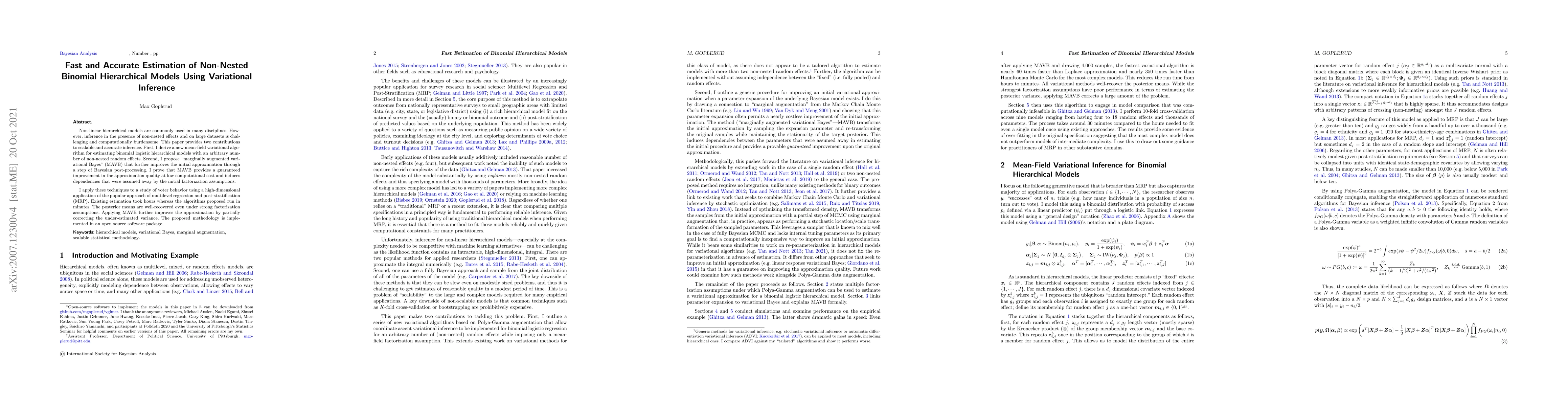 This paper introduces a new mean-field variational algorithm for estimating non-nested binomial logistic hierarchical models and proposes "marginally augmented variational Bayes" (MAVB) to enhance inference accuracy, demonstrating significant speed improvements in a voter behavior study.
