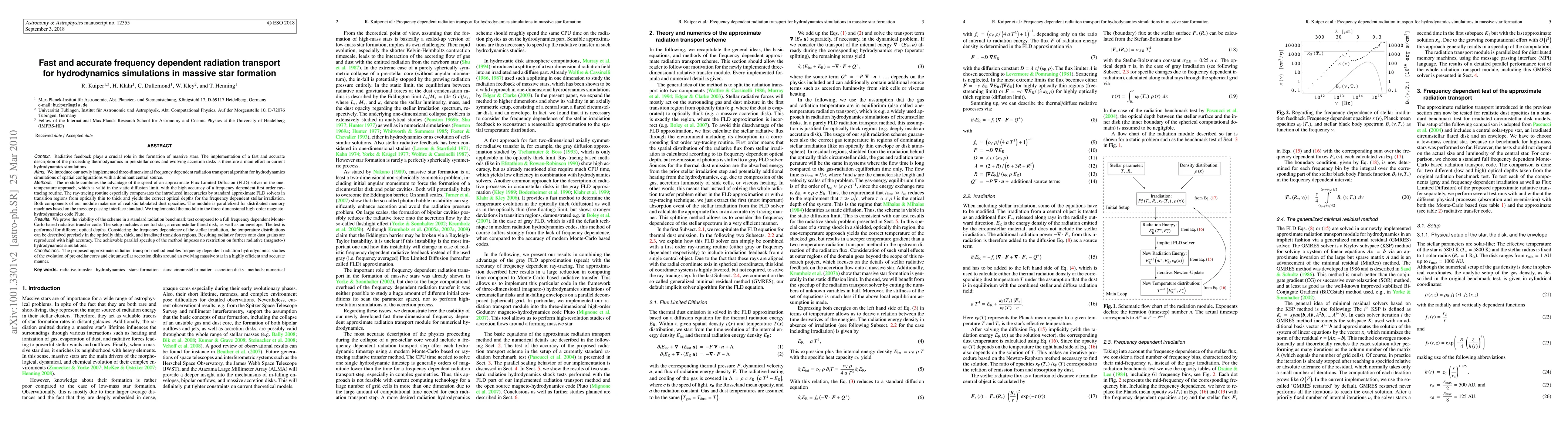 Context: Radiative feedback plays a crucial role in the formation of massive stars. The implementation of a fast and accurate description of the proceeding thermodynamics in pre-stellar cores and evolving accretion disks is therefore a main effort in current hydrodynamics simulations. Aims: We introduce our newly implemented three-dimensional frequency dependent radiation transport algorithm for hydrodynamics simulations of spatial configurations with a dominant central source. Methods: The module combines the advantage of the speed of an approximate Flux Limited Diffusion (FLD) solver with the high accuracy of a frequency dependent first order ray-tracing routine. Results: We prove the viability of the scheme in a standard radiation benchmark test compared to a full frequency dependent Monte-Carlo based radiative transfer code. The setup includes a central star, a circumstellar flared disk, as well as an envelope. The test is performed for different optical depths. Considering the frequency dependence of the stellar irradiation, the temperature distributions can be described precisely in the optically thin, thick, and irradiated transition regions. Resulting radiative forces onto dust grains are reproduced with high accuracy. The achievable parallel speedup of the method imposes no restriction on further radiative (magneto-) hydrodynamics simulations. Conclusions: The proposed approximate radiation transport method enables frequency dependent radiation hydrodynamics studies of the evolution of pre-stellar cores and circumstellar accretion disks around an evolving massive star in a highly efficient and accurate manner.