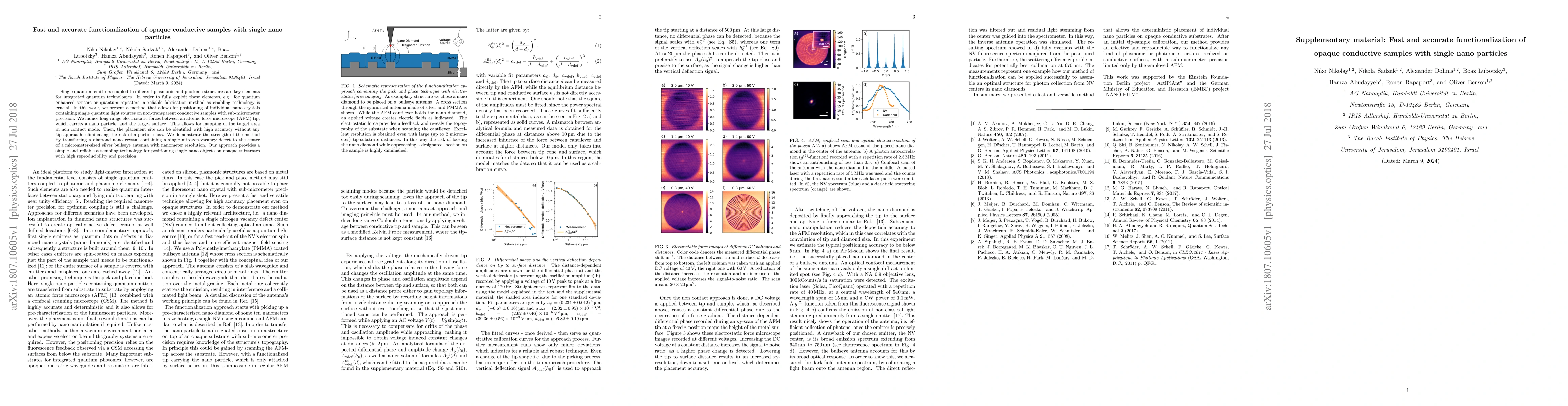 This paper presents a novel method for accurately positioning single nano crystals with quantum light sources on opaque conductive samples using electrostatic forces induced by an AFM tip. The technique demonstrates high precision and reliability, as shown by the successful placement of a diamond nano crystal onto a silver antenna.
