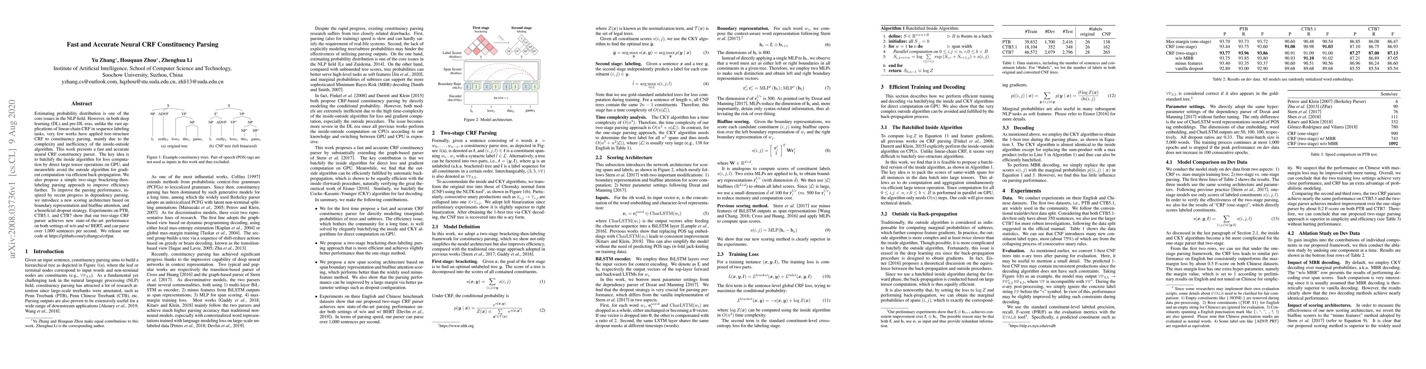 This research develops a fast and accurate neural CRF constituency parser that efficiently processes large tensor operations on GPUs and introduces a two-stage bracketing-then-labeling approach for improved parsing performance. The parser achieves state-of-the-art results on multiple datasets and can parse over 1,000 sentences per second.