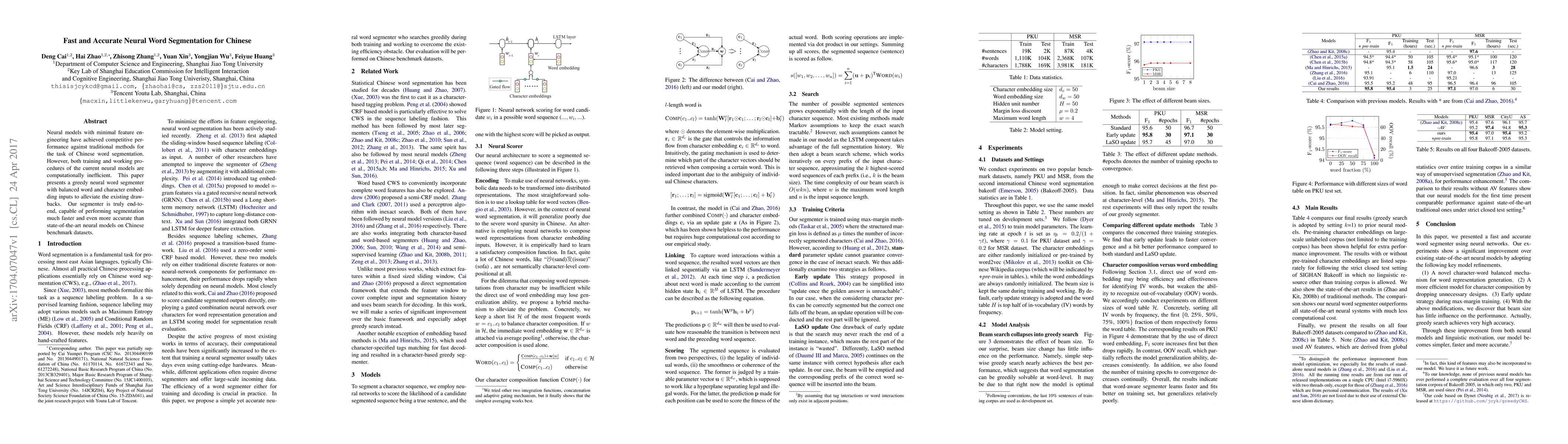 This paper introduces a fast and accurate neural word segmenter for Chinese that combines balanced word and character embeddings, achieving better efficiency and accuracy compared to existing neural models, while maintaining end-to-end training.