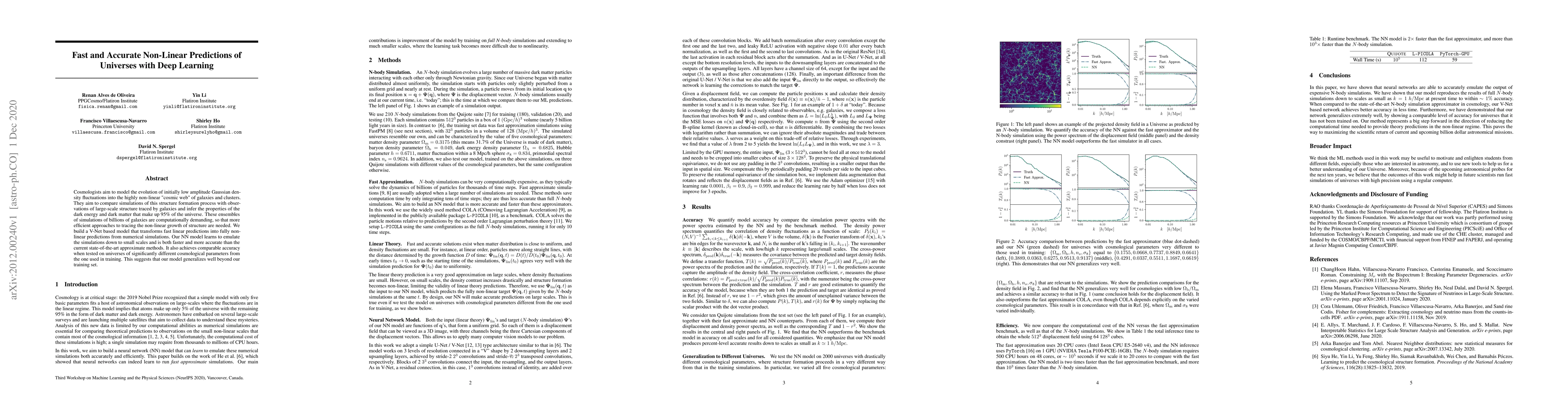 Cosmologists aim to model the evolution of initially low amplitude Gaussian density fluctuations into the highly non-linear "cosmic web" of galaxies and clusters. They aim to compare simulations of this structure formation process with observations of large-scale structure traced by galaxies and infer the properties of the dark energy and dark matter that make up 95% of the universe. These ensembles of simulations of billions of galaxies are computationally demanding, so that more efficient approaches to tracing the non-linear growth of structure are needed. We build a V-Net based model that transforms fast linear predictions into fully nonlinear predictions from numerical simulations. Our NN model learns to emulate the simulations down to small scales and is both faster and more accurate than the current state-of-the-art approximate methods. It also achieves comparable accuracy when tested on universes of significantly different cosmological parameters from the one used in training. This suggests that our model generalizes well beyond our training set.