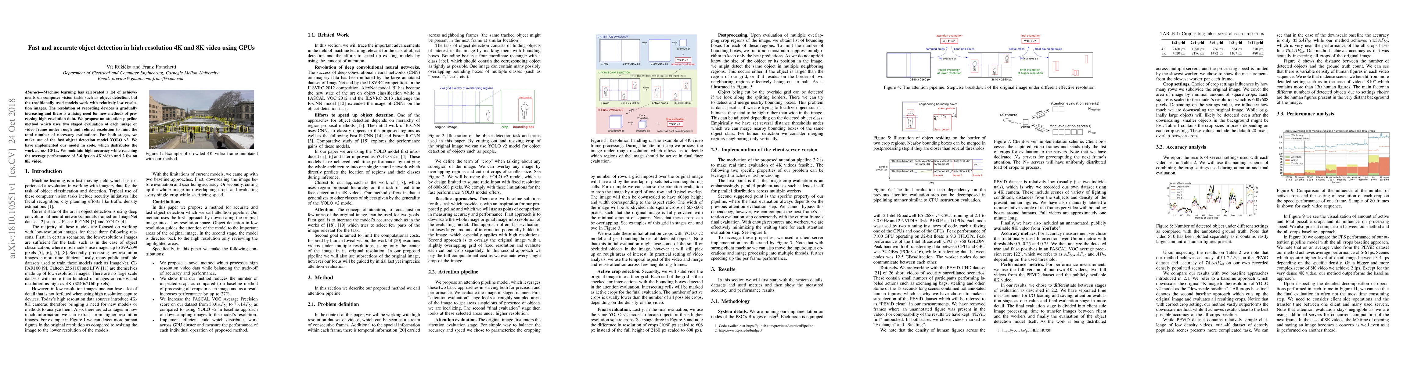 This paper proposes an efficient object detection method for high-resolution videos using GPUs, achieving 3-6 fps on 4K and 2 fps on 8K, with high accuracy.