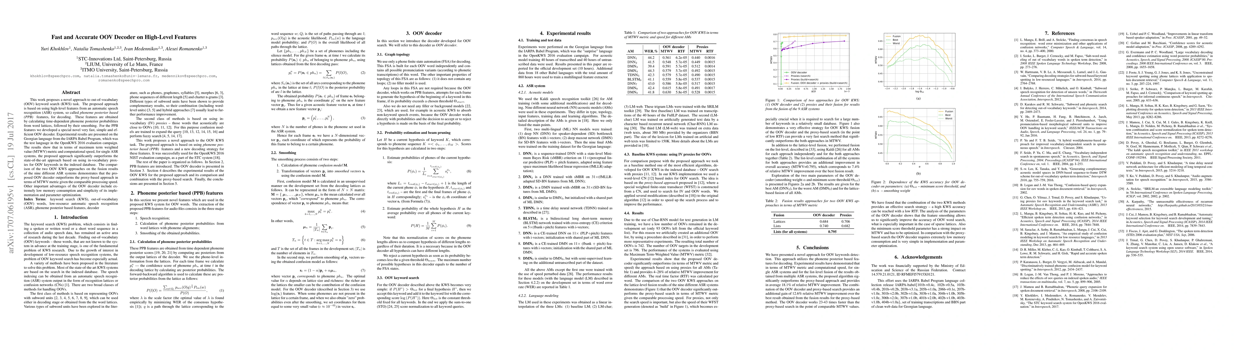 A novel OOV decoder approach using high-level ASR features outperforms state-of-the-art methods with faster processing speed and lower memory consumption.