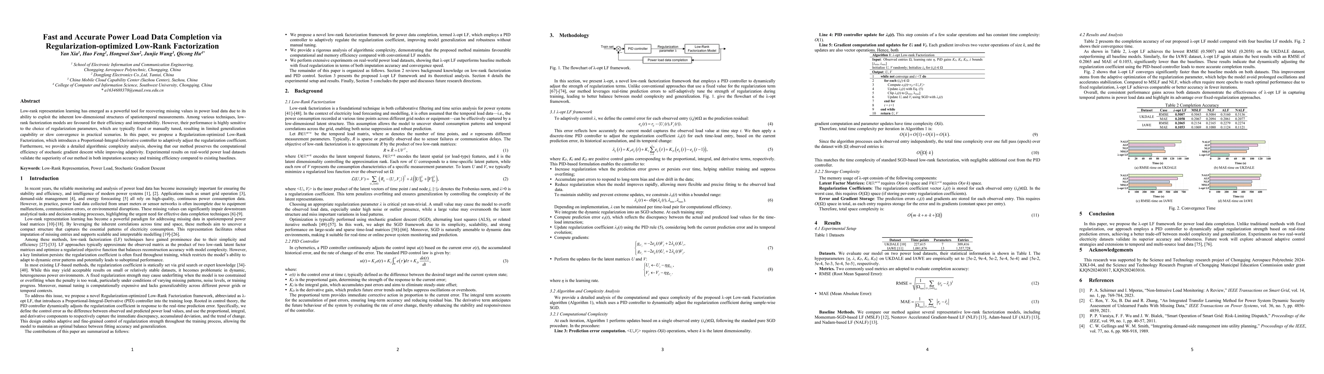 Researchers propose a method to improve power load data completion using low-rank factorization with adaptive regularization, achieving higher imputation accuracy and training efficiency compared to existing methods.