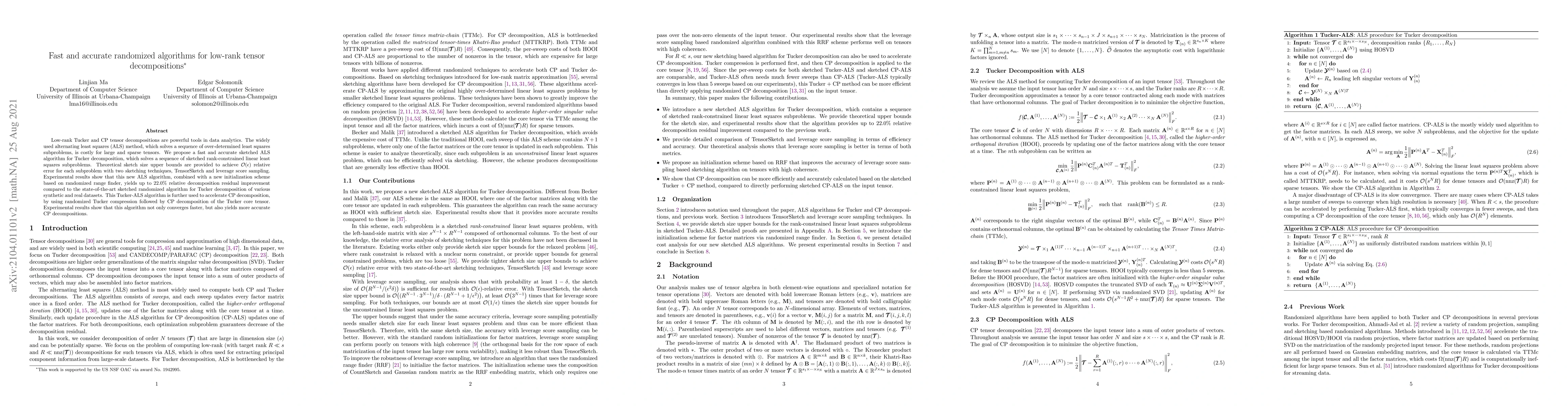 This paper proposes a fast and accurate randomized algorithm for low-rank Tucker tensor decomposition, significantly improving upon the traditional ALS method. The new sketched ALS algorithm, combined with a novel initialization scheme, achieves up to 22% better decomposition accuracy compared to existing methods, and also accelerates CP decomposition.