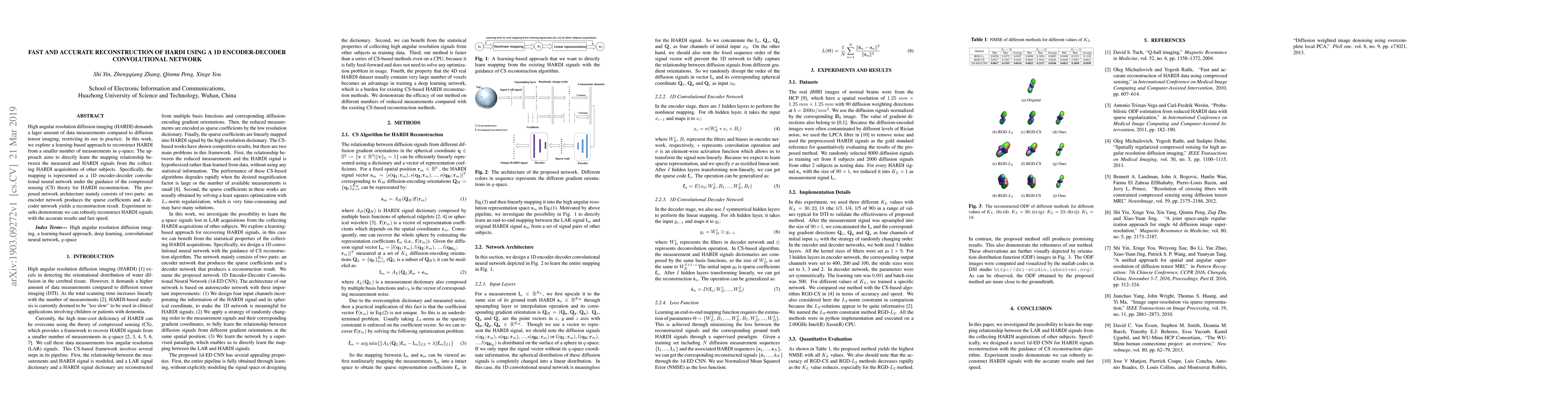 This paper proposes a 1D encoder-decoder convolutional neural network for fast and accurate reconstruction of High Angular Resolution Diffusion Imaging (HARDI) from fewer measurements. The network leverages compressed sensing theory and demonstrates robust reconstruction with accurate results and high speed.