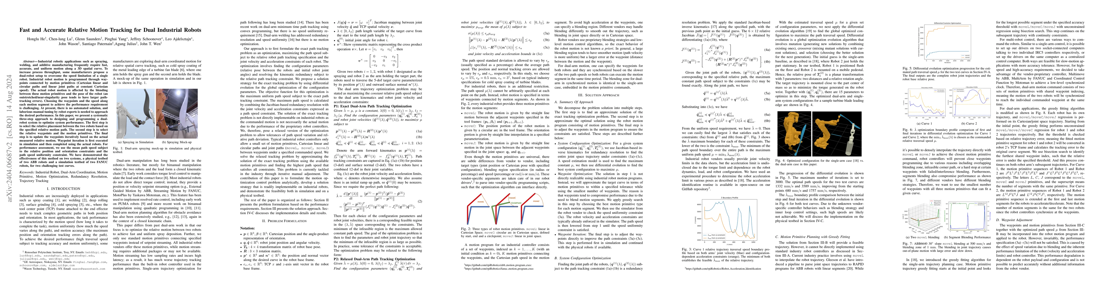 Industrial robotic applications such as spraying, welding, and additive manufacturing frequently require fast, accurate, and uniform motion along a 3D spatial curve. To increase process throughput, some manufacturers propose a dual-robot setup to overcome the speed limitation of a single robot. Industrial robot motion is programmed through waypoints connected by motion primitives (Cartesian linear and circular paths and linear joint paths at constant Cartesian speed). The actual robot motion is affected by the blending between these motion primitives and the pose of the robot (an outstretched/close to singularity pose tends to have larger path-tracking errors). Choosing the waypoints and the speed along each motion segment to achieve the performance requirement is challenging. At present, there is no automated solution, and laborious manual tuning by robot experts is needed to approach the desired performance. In this paper, we present a systematic three-step approach to designing and programming a dual-robot system to optimize system performance. The first step is to select the relative placement between the two robots based on the specified relative motion path. The second step is to select the relative waypoints and the motion primitives. The final step is to update the waypoints iteratively based on the actual relative motion. Waypoint iteration is first executed in simulation and then completed using the actual robots. For performance measures, we use the mean path speed subject to the relative position and orientation constraints and the path speed uniformity constraint. We have demonstrated the effectiveness of this method with ABB and FANUC robots on two challenging test curves. The performance improvement over the current industrial practice baseline is over 300%. Compared to the optimized single-arm case that we have previously reported, the improvement is over 14%.