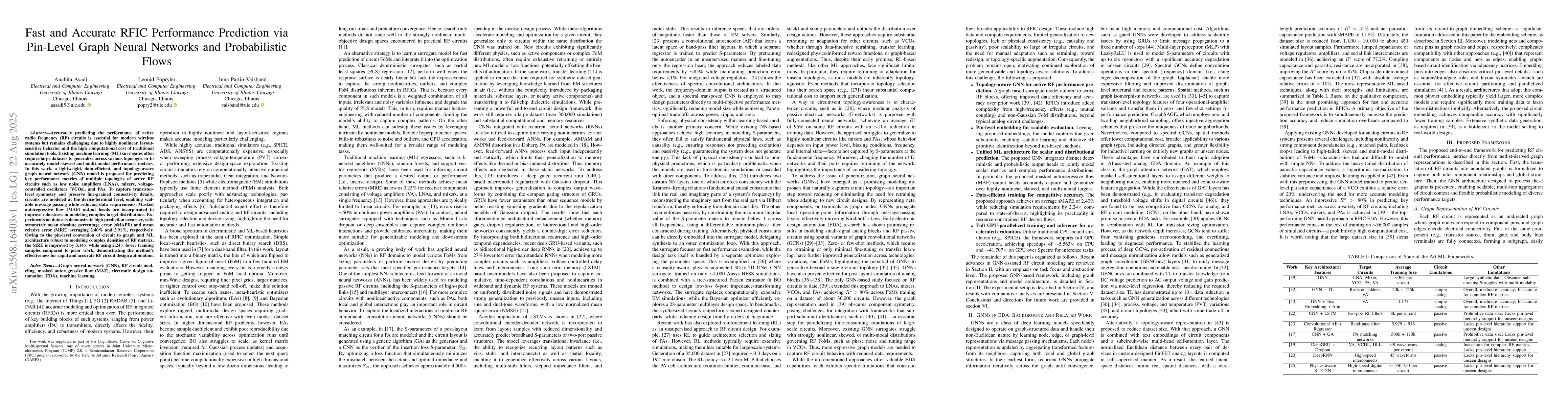 Accurately predicting the performance of active radio frequency (RF) circuits is essential for modern wireless systems but remains challenging due to highly nonlinear, layout-sensitive behavior and the high computational cost of traditional simulation tools. Existing machine learning (ML) surrogates often require large datasets to generalize across various topologies or to accurately model skewed and multi-modal performance metrics. In this work, a lightweight, data-efficient, and topology-aware graph neural network (GNN) model is proposed for predicting key performance metrics of multiple topologies of active RF circuits such as low noise amplifiers (LNAs), mixers, voltage-controlled oscillators (VCOs), and PAs. To capture transistor-level symmetry and preserve fine-grained connectivity details, circuits are modeled at the device-terminal level, enabling scalable message passing while reducing data requirements. Masked autoregressive flow (MAF) output heads are incorporated to improve robustness in modeling complex target distributions. Experiments on datasets demonstrate high prediction accuracy, with symmetric mean absolute percentage error (sMAPE) and mean relative error (MRE) averaging 2.40% and 2.91%, respectively. Owing to the pin-level conversion of circuit to graph and ML architecture robust to modeling complex densities of RF metrics, the MRE is improved by 3.14x while using 2.24x fewer training samples compared to prior work, demonstrating the method's effectiveness for rapid and accurate RF circuit design automation.