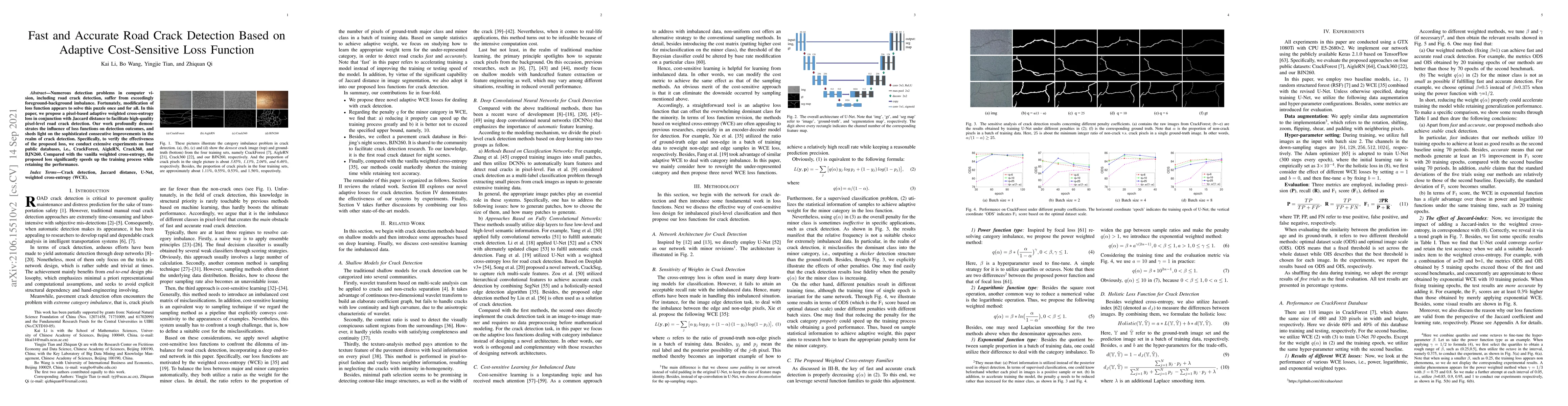 This paper proposes an adaptive cost-sensitive loss function combining weighted cross-entropy and Jaccard distance for accurate road crack detection, addressing the imbalance between foreground and background. Experiments on four public datasets show significant improvements in training speed and accuracy compared to traditional methods.