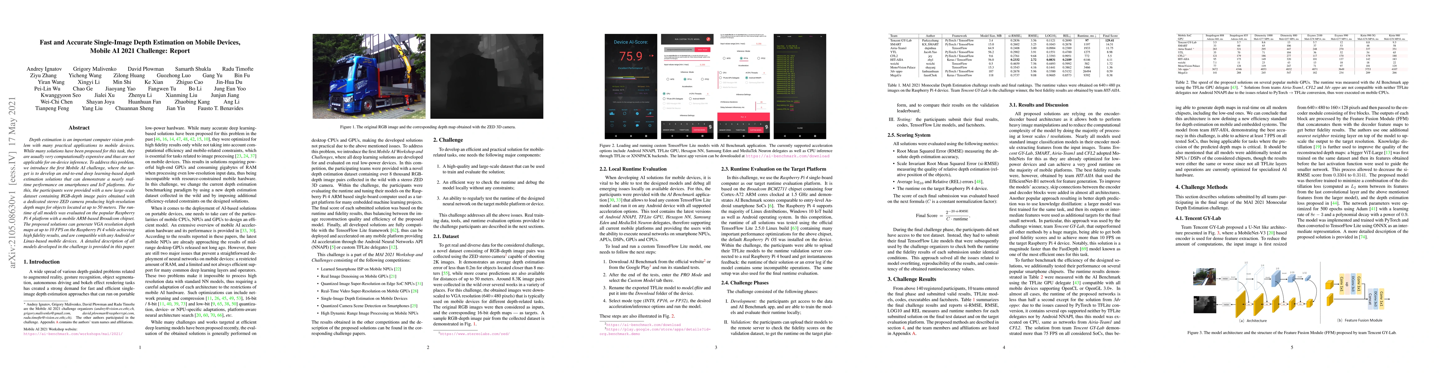 This paper reports on the Mobile AI 2021 Challenge, which aimed to develop efficient deep learning models for real-time single-image depth estimation on mobile devices. The challenge introduced a new large-scale RGB-depth dataset and evaluated solutions on the Raspberry Pi 4, achieving VGA resolution depth maps at 10 FPS with high fidelity.