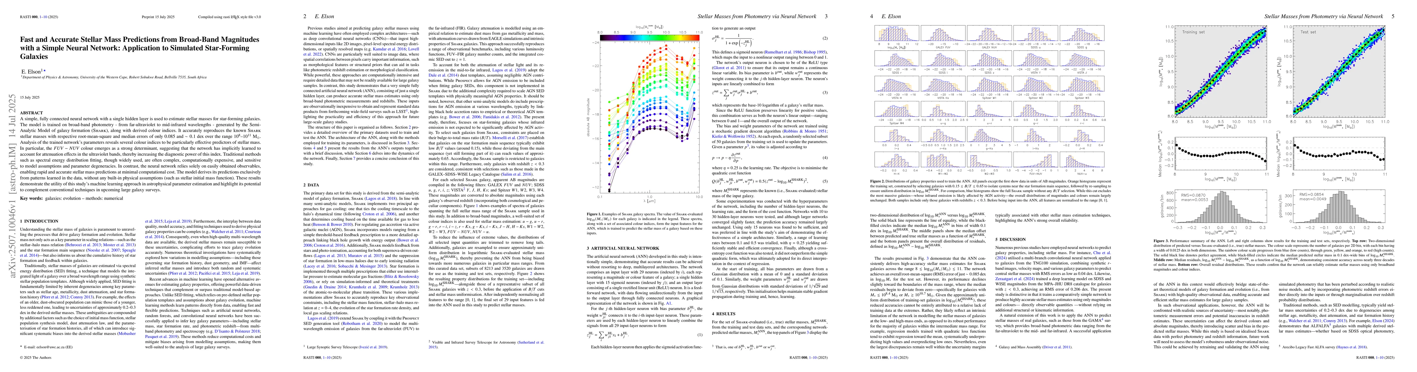 A simple, fully connected neural network with a single hidden layer is used to estimate stellar masses for star-forming galaxies. The model is trained on broad-band photometry - from far-ultraviolet to mid-infrared wavelengths - generated by the Semi-Analytic Model of galaxy formation (SHARK), along with derived colour indices. It accurately reproduces the known SHARK stellar masses with respective root-mean-square and median errors of only 0.085 and 0.1 dex over the three decades in stellar mass. Analysis of the trained network's parameters reveals several colour indices to be particularly effective predictors of stellar mass. In particular, the FUV - NUV colour emerges as a strong determinant, suggesting that the network has implicitly learned to account for attenuation effects in the ultraviolet bands, thereby increasing the diagnostic power of this index. Traditional methods such as spectral energy distribution fitting, though widely used, are often complex, computationally expensive, and sensitive to model assumptions and parameter degeneracies. In contrast, the neural network relies solely on easily obtained observables, enabling rapid and accurate stellar mass predictions at minimal computational cost. The model derives its predictions exclusively from patterns learned in the data, without any built-in physical assumptions (such as stellar initial mass function). These results demonstrate the utility of this study's machine learning approach in astrophysical parameter estimation and highlight its potential to complement conventional techniques in upcoming large galaxy surveys.