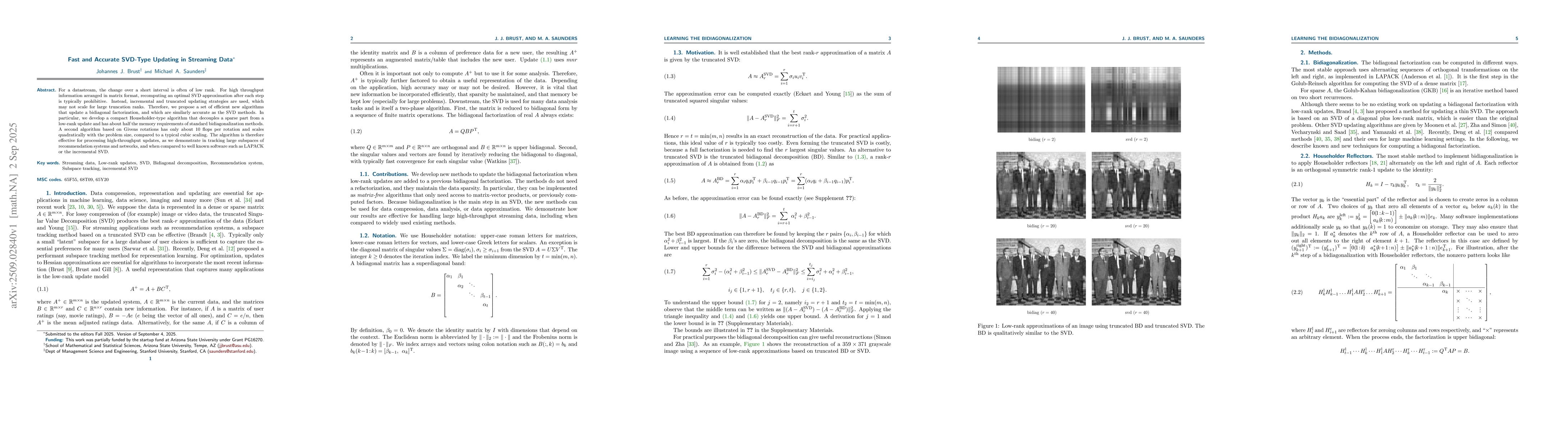 For a datastream, the change over a short interval is often of low rank. For high throughput information arranged in matrix format, recomputing an optimal SVD approximation after each step is typically prohibitive. Instead, incremental and truncated updating strategies are used, which may not scale for large truncation ranks. Therefore, we propose a set of efficient new algorithms that update a bidiagonal factorization, and which are similarly accurate as the SVD methods. In particular, we develop a compact Householder-type algorithm that decouples a sparse part from a low-rank update and has about half the memory requirements of standard bidiagonalization methods. A second algorithm based on Givens rotations has only about 10 flops per rotation and scales quadratically with the problem size, compared to a typical cubic scaling. The algorithm is therefore effective for processing high-throughput updates, as we demonstrate in tracking large subspaces of recommendation systems and networks, and when compared to well known software such as LAPACK or the incremental SVD.