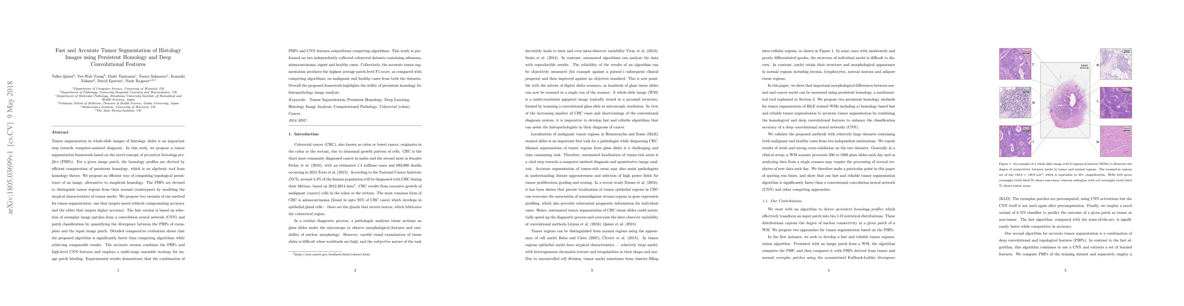 Tumor segmentation in whole-slide images of histology slides is an important step towards computer-assisted diagnosis. In this work, we propose a tumor segmentation framework based on the novel concept of persistent homology profiles (PHPs). For a given image patch, the homology profiles are derived by efficient computation of persistent homology, which is an algebraic tool from homology theory. We propose an efficient way of computing topological persistence of an image, alternative to simplicial homology. The PHPs are devised to distinguish tumor regions from their normal counterparts by modeling the atypical characteristics of tumor nuclei. We propose two variants of our method for tumor segmentation: one that targets speed without compromising accuracy and the other that targets higher accuracy. The fast version is based on the selection of exemplar image patches from a convolution neural network (CNN) and patch classification by quantifying the divergence between the PHPs of exemplars and the input image patch. Detailed comparative evaluation shows that the proposed algorithm is significantly faster than competing algorithms while achieving comparable results. The accurate version combines the PHPs and high-level CNN features and employs a multi-stage ensemble strategy for image patch labeling. Experimental results demonstrate that the combination of PHPs and CNN features outperforms competing algorithms. This study is performed on two independently collected colorectal datasets containing adenoma, adenocarcinoma, signet and healthy cases. Collectively, the accurate tumor segmentation produces the highest average patch-level F1-score, as compared with competing algorithms, on malignant and healthy cases from both the datasets. Overall the proposed framework highlights the utility of persistent homology for histopathology image analysis.