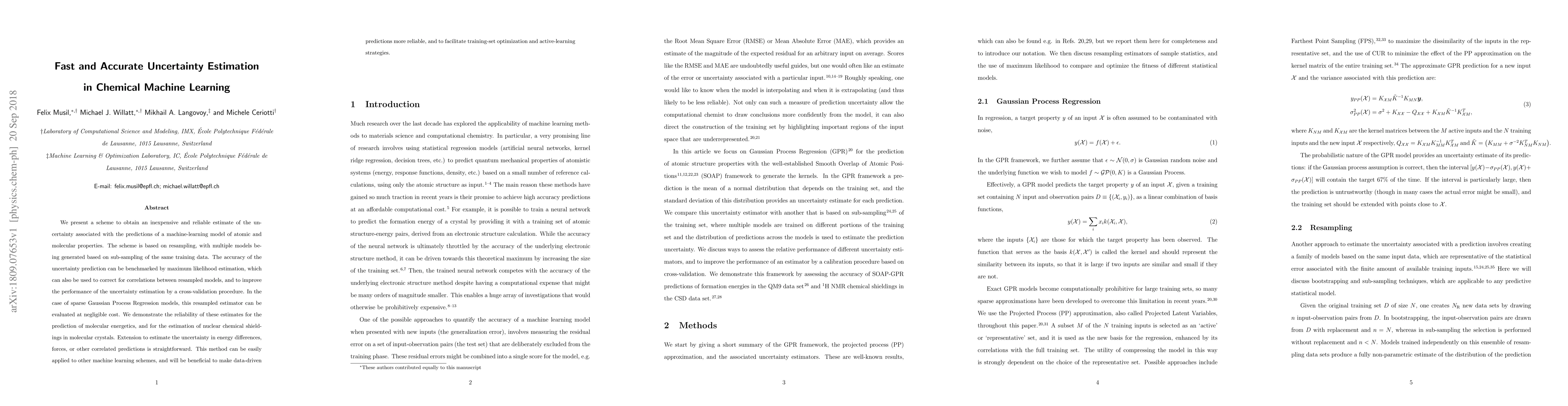This paper proposes a cost-effective method for estimating uncertainty in chemical machine learning predictions using resampling and multiple sub-sampled models. It demonstrates the method's reliability for predicting molecular energetics and nuclear chemical shieldings, and suggests its applicability to other machine learning schemes to enhance prediction reliability.