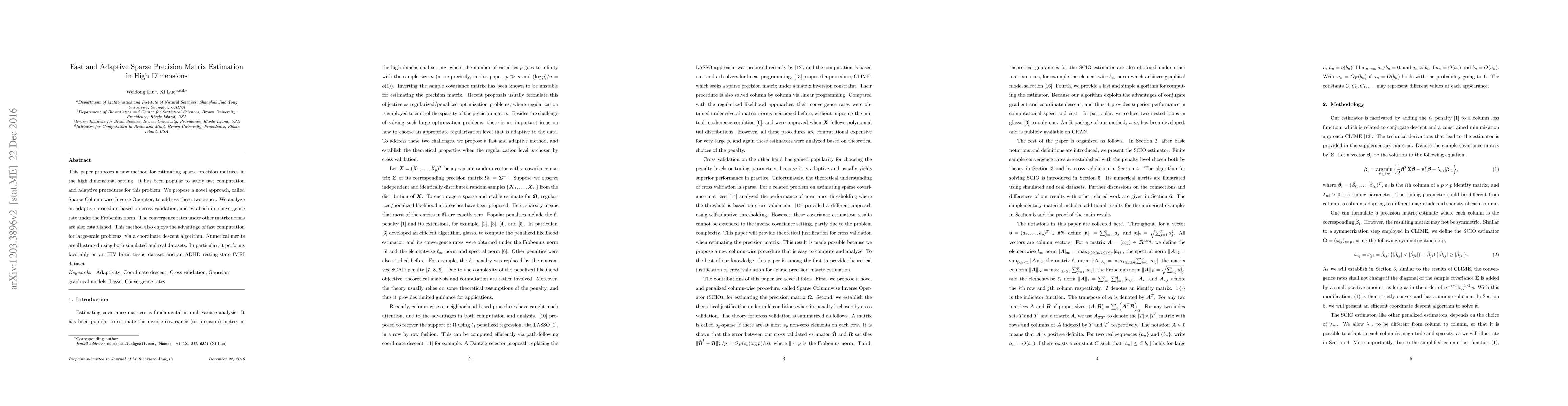 This paper introduces a novel Sparse Column-wise Inverse Operator method for estimating sparse precision matrices in high-dimensional settings, featuring fast computation and adaptive procedures. The method is analyzed for convergence rates and demonstrated through simulations and real datasets, showing favorable performance on brain tissue and fMRI datasets.