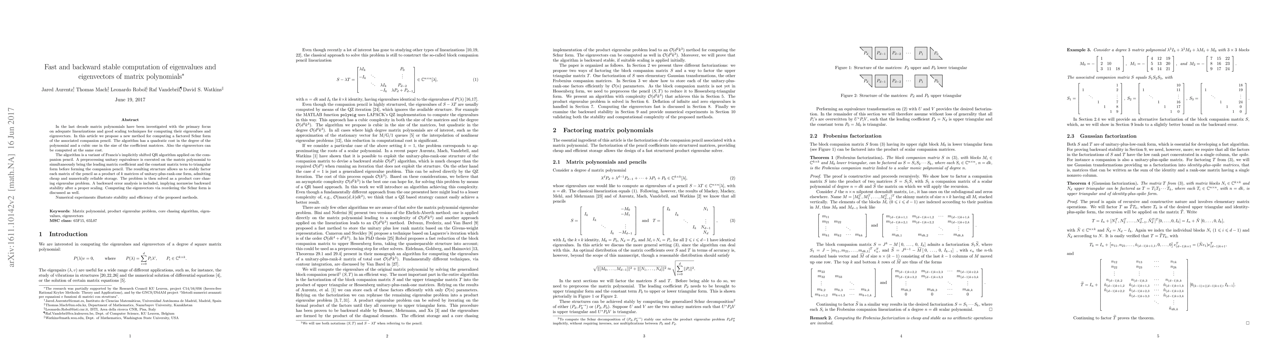 In the last decade matrix polynomials have been investigated with the primary focus on adequate linearizations and good scaling techniques for computing their eigenvalues and eigenvectors. In this article we propose a new method for computing a factored Schur form of the associated companion pencil. The algorithm has a quadratic cost in the degree of the polynomial and a cubic one in the size of the coefficient matrices. Also the eigenvectors can be computed at the same cost. The algorithm is a variant of Francis's implicitly shifted QR algorithm applied on the companion pencil. A preprocessing unitary equivalence is executed on the matrix polynomial to simultaneously bring the leading matrix coefficient and the constant matrix term to triangular form before forming the companion pencil. The resulting structure allows us to stably factor each matrix of the pencil as a product of $k$ matrices of unitary-plus-rank-one form, admitting cheap and numerically reliable storage. The problem is then solved as a product core chasing eigenvalue problem. A backward error analysis is included, implying normwise backward stability after a proper scaling. Computing the eigenvectors via reordering the Schur form is discussed as well. Numerical experiments illustrate stability and efficiency of the proposed methods.