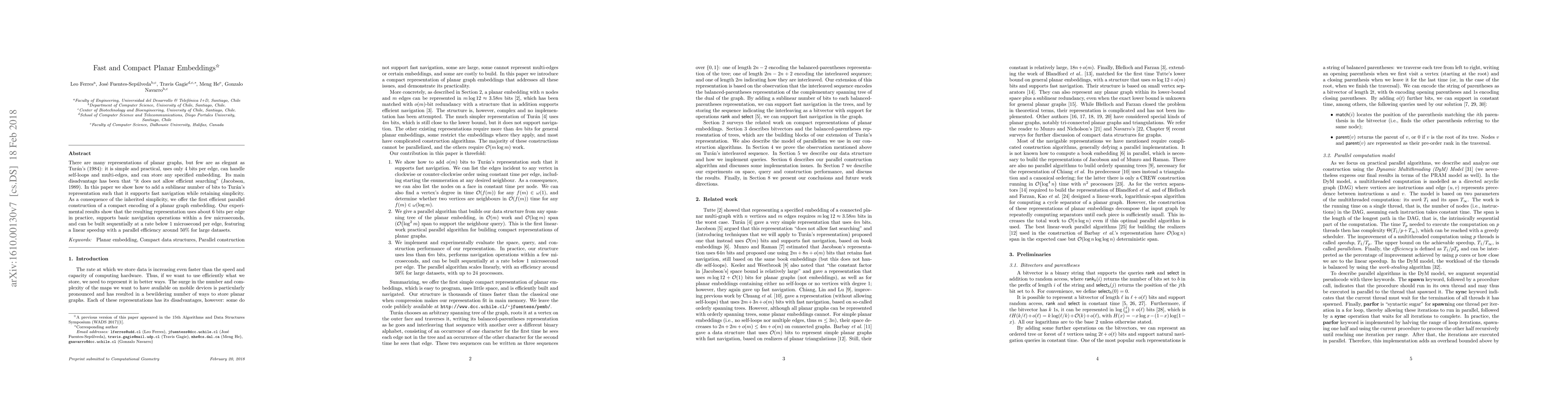 There are many representations of planar graphs, but few are as elegant as Tur\'an's (1984): it is simple and practical, uses only 4 bits per edge, can handle self-loops and multi-edges, and can store any specified embedding. Its main disadvantage has been that "it does not allow efficient searching" (Jacobson, 1989). In this paper we show how to add a sublinear number of bits to Tur\'an's representation such that it supports fast navigation while retaining simplicity. As a consequence of the inherited simplicity, we offer the first efficient parallel construction of a compact encoding of a planar graph embedding. Our experimental results show that the resulting representation uses about 6 bits per edge in practice, supports basic navigation operations within a few microseconds, and can be built sequentially at a rate below 1 microsecond per edge, featuring a linear speedup with a parallel efficiency around 50\% for large datasets.