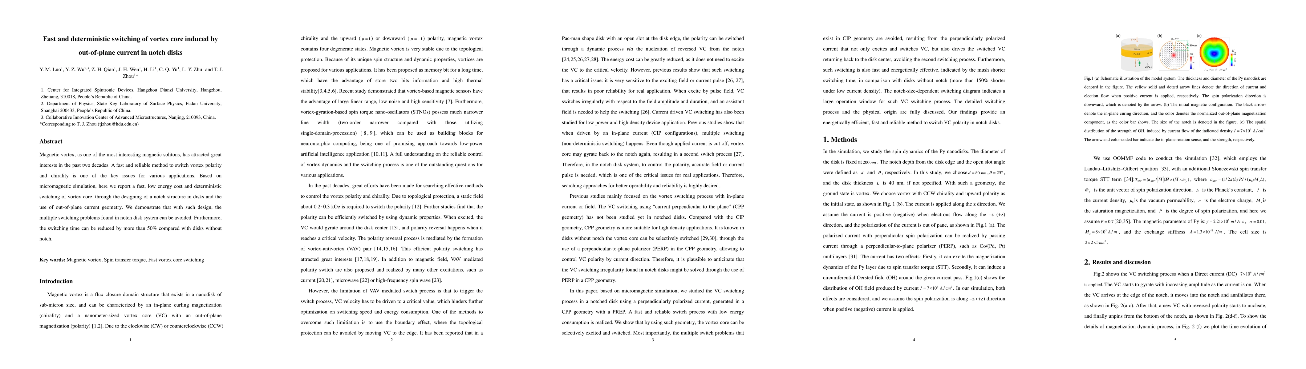 This paper reports a method for fast, low-energy, and deterministic switching of magnetic vortex polarity and chirality using a notch disk structure and out-of-plane current, significantly reducing switching time by over 50% compared to conventional designs. The proposed design avoids multiple switching issues typically found in notch disk systems.