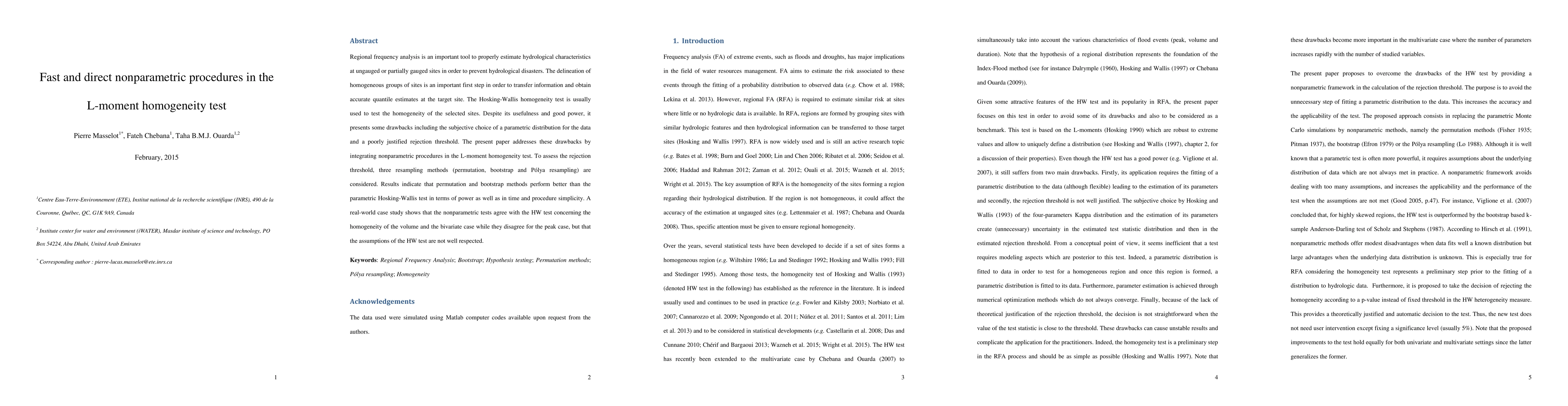 Regional frequency analysis is an important tool to properly estimate hydrological characteristics at ungauged or partially gauged sites in order to prevent hydrological disasters. The delineation of homogeneous groups of sites is an important first step in order to transfer information and obtain accurate quantile estimates at the target site. The Hosking-Wallis homogeneity test is usually used to test the homogeneity of the selected sites. Despite its usefulness and good power, it presents some drawbacks including the subjective choice of a parametric distribution for the data and a poorly justified rejection threshold. The present paper addresses these drawbacks by integrating nonparametric procedures in the L-moment homogeneity test. To assess the rejection threshold, three resampling methods (permutation, bootstrap and P\'olya resampling) are considered. Results indicate that permutation and bootstrap methods perform better than the parametric Hosking-Wallis test in terms of power as well as in time and procedure simplicity. A real-world case study shows that the nonparametric tests agree with the HW test concerning the homogeneity of the volume and the bivariate case while they disagree for the peak case, but that the assumptions of the HW test are not well respected.