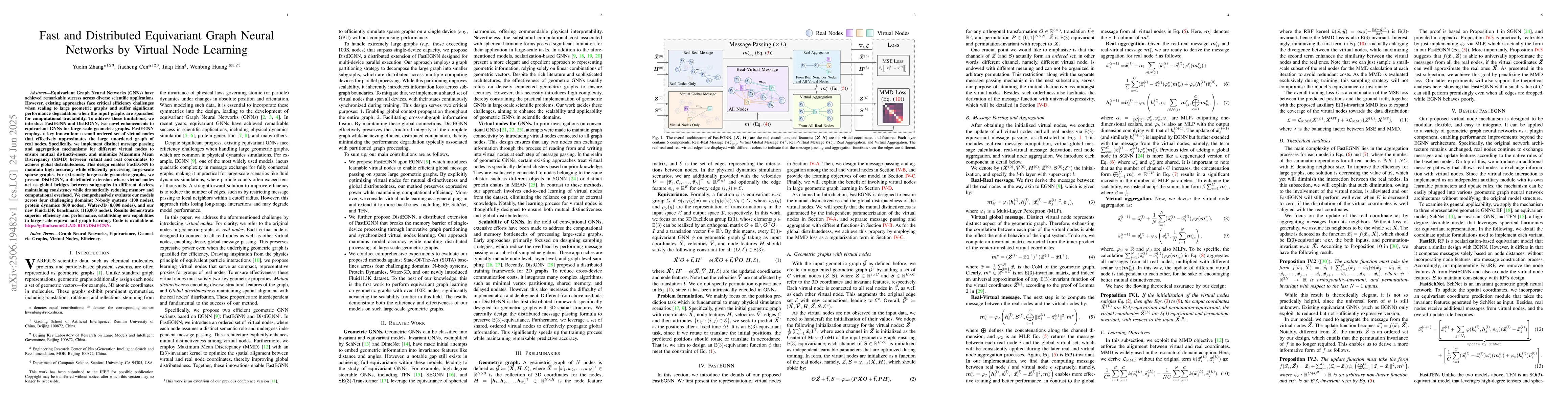 Equivariant Graph Neural Networks (GNNs) have achieved remarkable success across diverse scientific applications. However, existing approaches face critical efficiency challenges when scaling to large geometric graphs and suffer significant performance degradation when the input graphs are sparsified for computational tractability. To address these limitations, we introduce FastEGNN and DistEGNN, two novel enhancements to equivariant GNNs for large-scale geometric graphs. FastEGNN employs a key innovation: a small ordered set of virtual nodes that effectively approximates the large unordered graph of real nodes. Specifically, we implement distinct message passing and aggregation mechanisms for different virtual nodes to ensure mutual distinctiveness, and minimize Maximum Mean Discrepancy (MMD) between virtual and real coordinates to achieve global distributedness. This design enables FastEGNN to maintain high accuracy while efficiently processing large-scale sparse graphs. For extremely large-scale geometric graphs, we present DistEGNN, a distributed extension where virtual nodes act as global bridges between subgraphs in different devices, maintaining consistency while dramatically reducing memory and computational overhead. We comprehensively evaluate our models across four challenging domains: N-body systems (100 nodes), protein dynamics (800 nodes), Water-3D (8,000 nodes), and our new Fluid113K benchmark (113,000 nodes). Results demonstrate superior efficiency and performance, establishing new capabilities in large-scale equivariant graph learning. Code is available at https://github.com/GLAD-RUC/DistEGNN.