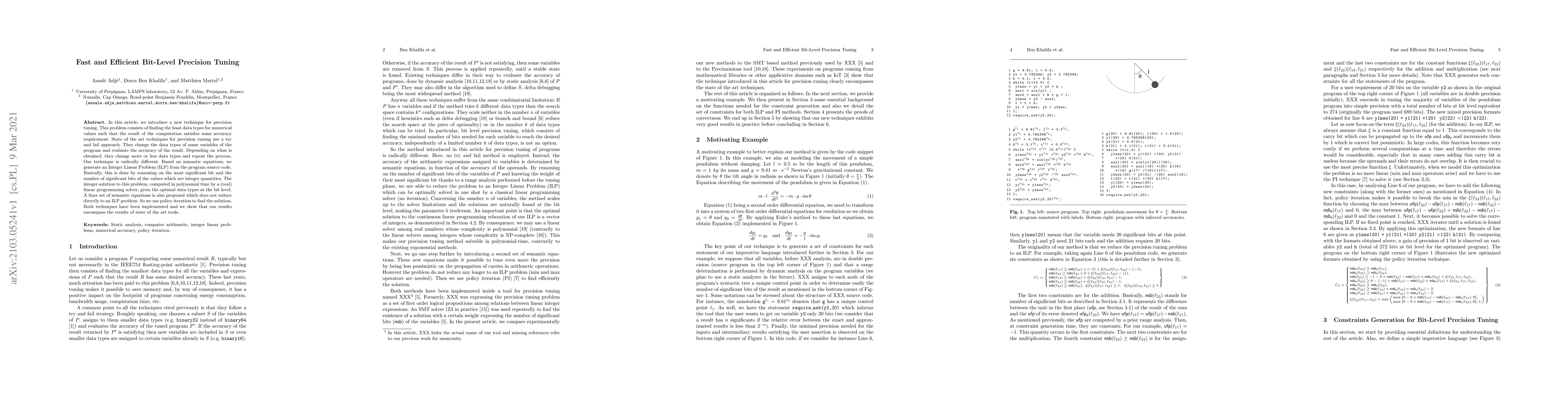 In this article, we introduce a new technique for precision tuning. This problem consists of finding the least data types for numerical values such that the result of the computation satisfies some accuracy requirement. State of the art techniques for precision tuning use a try and fail approach. They change the data types of some variables of the program and evaluate the accuracy of the result. Depending on what is obtained, they change more or less data types and repeat the process. Our technique is radically different. Based on semantic equations, we generate an Integer Linear Problem (ILP) from the program source code. Basically, this is done by reasoning on the most significant bit and the number of significant bits of the values which are integer quantities. The integer solution to this problem, computed in polynomial time by a (real) linear programming solver, gives the optimal data types at the bit level. A finer set of semantic equations is also proposed which does not reduce directly to an ILP problem. So we use policy iteration to find the solution. Both techniques have been implemented and we show that our results encompass the results of state of the art tools.