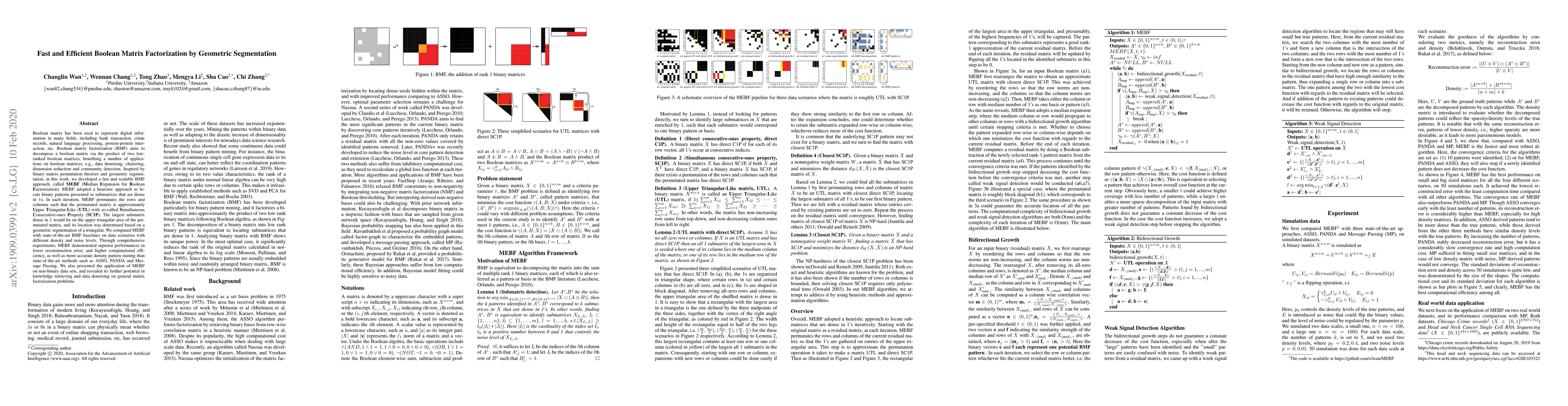 The paper presents MEBF, a fast and efficient Boolean Matrix Factorization method using geometric segmentation to identify dense submatrices of 1's. MEBF outperforms other state-of-the-art methods in reconstruction error, computational efficiency, and pattern accuracy, demonstrating potential for knowledge retrieval and data denoising.