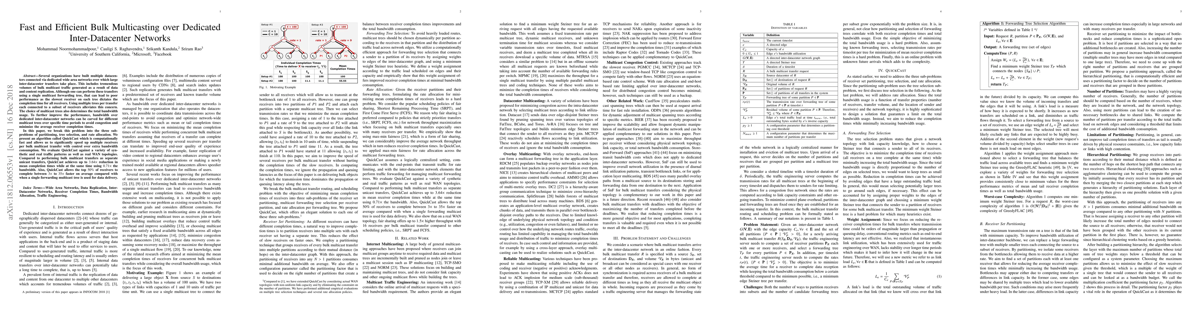 This paper proposes QuickCast, an algorithm to efficiently manage bulk multicast traffic over dedicated inter-datacenter networks by partitioning traffic, selecting optimal multicast trees, and allocating bandwidth to minimize completion times while controlling bandwidth usage. QuickCast achieves up to 3.64x reduction in mean completion times compared to unicast transfers.