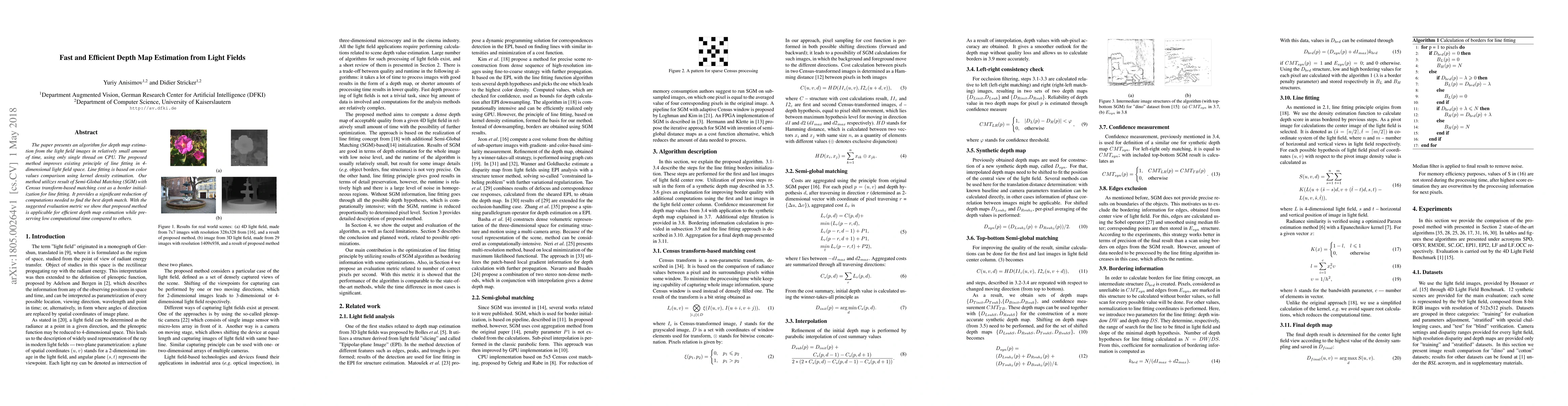 The paper introduces an efficient algorithm for depth map estimation from light field images, utilizing line fitting in 4D space and kernel density estimation for improved accuracy. The method leverages Semi-Global Matching with Census transform-based matching cost for initialization, significantly reducing computational load while maintaining high accuracy.