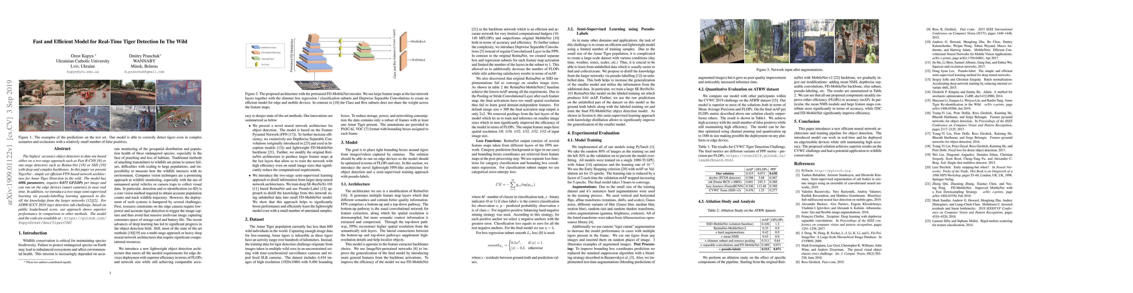 The highest accuracy object detectors to date are based either on a two-stage approach such as Fast R-CNN or one-stage detectors such as Retina-Net or SSD with deep and complex backbones. In this paper we present TigerNet - simple yet efficient FPN based network architecture for Amur Tiger Detection in the wild. The model has 600k parameters, requires 0.071 GFLOPs per image and can run on the edge devices (smart cameras) in near real time. In addition, we introduce a two-stage semi-supervised learning via pseudo-labelling learning approach to distill the knowledge from the larger networks. For ATRW-ICCV 2019 tiger detection sub-challenge, based on public leaderboard score, our approach shows superior performance in comparison to other methods.