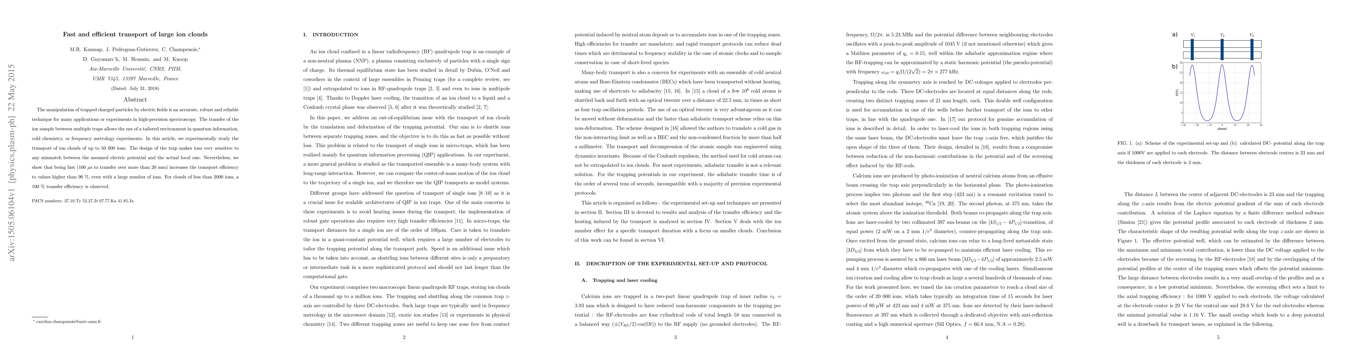 The manipulation of trapped charged particles by electric fields is an accurate, robust and reliable technique for many applications or experiments in high-precision spectroscopy. The transfer of the ion sample between multiple traps allows the use of a tailored environment in quantum information, cold chemistry, or frequency metrology experiments. In this article, we experimentally study the transport of ion clouds of up to 50 000 ions. The design of the trap makes ions very sensitive to any mismatch between the assumed electric potential and the actual local one. Nevertheless, we show that being fast (100 $\mu$s to transfer over more than 20 mm) increases the transport efficiency to values higher than 90 %, even with a large number of ions. For clouds of less than 2000 ions, a 100 % transfer efficiency is observed.