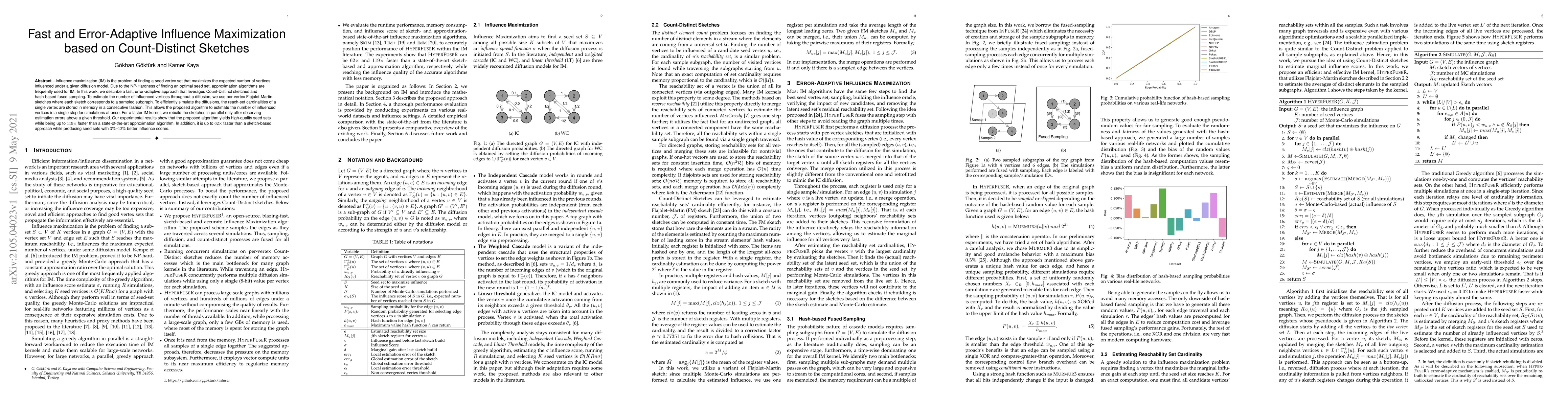A new algorithm for influence maximization uses Count-Distinct sketches to estimate influenced vertices, achieving speeds of up to 119x faster than a state-of-the-art approach while maintaining high-quality seed sets.