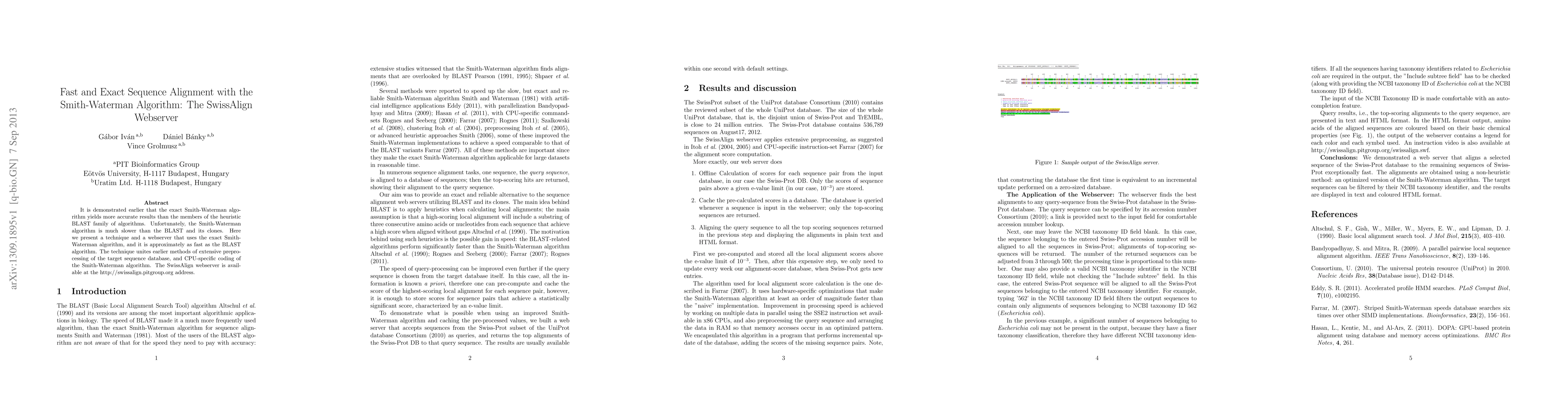 The paper introduces a fast implementation of the exact Smith-Waterman algorithm, achieving performance comparable to BLAST, using preprocessing and CPU-specific coding, available via the SwissAlign webserver at http://swissalign.pitgroup.org.