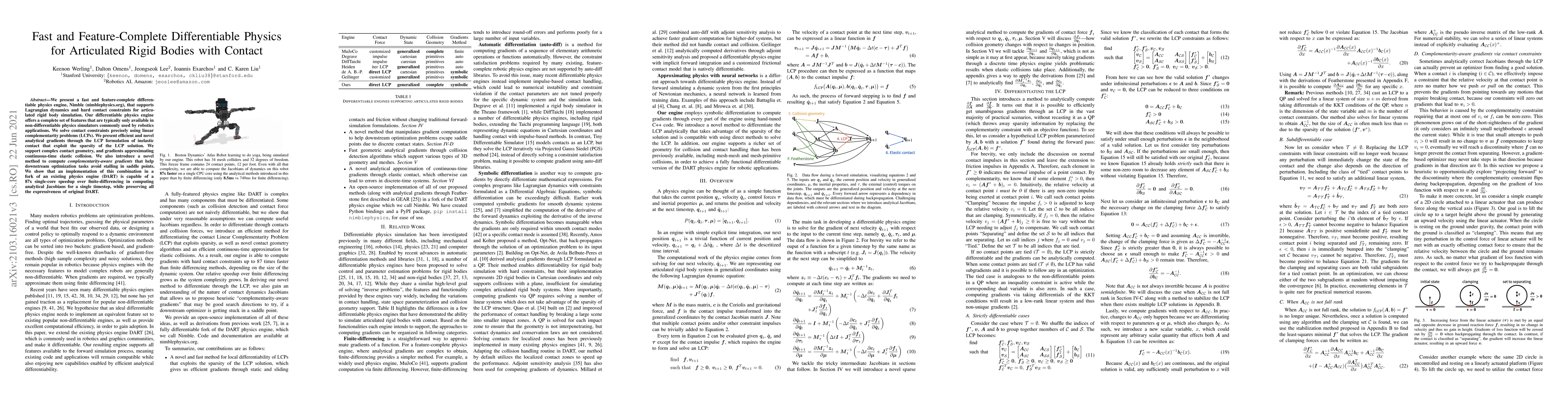 A new physics engine called Nimble offers fast and feature-complete differentiable physics for articulated rigid bodies with contact, achieving a 87x speedup over finite-differencing in computing analytical Jacobians.