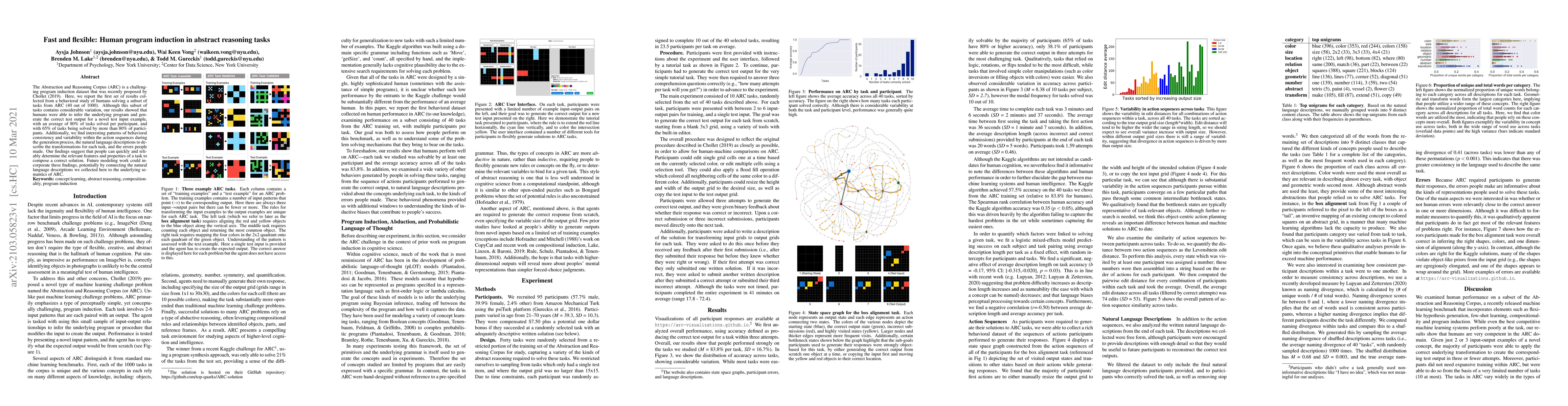 Humans can quickly and reliably solve abstract reasoning tasks with an average success rate of 80%, suggesting they can determine relevant features to compose correct solutions. Future modeling work could incorporate these findings, potentially connecting natural language descriptions to the underlying semantics of the task.