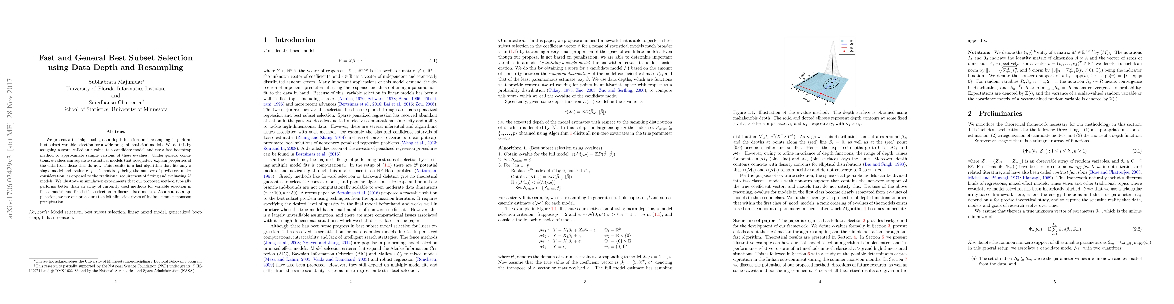 We present a technique using data depth functions and resampling to perform best subset variable selection for a wide range of statistical models. We do this by assigning a score, called an $e$-value, to a candidate model, and use a fast bootstrap method to approximate sample versions of these $e$-values. Under general conditions, $e$-values can separate statistical models that adequately explain properties of the data from those that do not. This results in a fast algorithm that fits only a single model and evaluates $p +1$ models, $p$ being the number of predictors under consideration, as opposed to the traditional requirement of fitting and evaluating $2^{p}$ models. We illustrate in simulation experiments that our proposed method typically performs better than an array of currently used methods for variable selection in linear models and fixed effect selection in linear mixed models. As a real data application, we use our procedure to elicit climatic drivers of Indian summer monsoon precipitation.