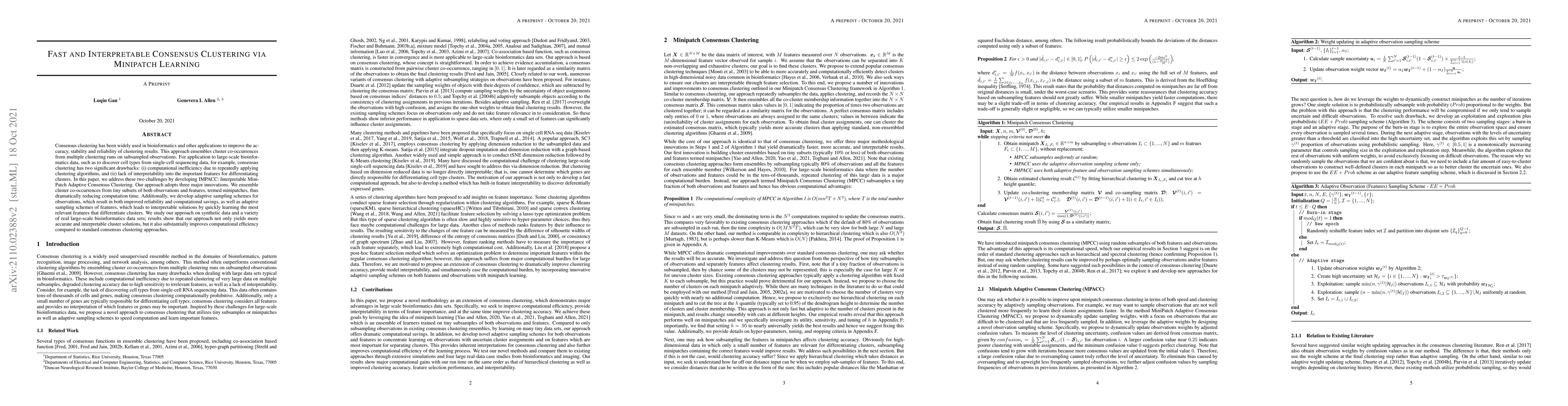 This paper introduces IMPACC, a novel consensus clustering method that uses minipatches to significantly reduce computational time and enhance interpretability. By adaptively sampling both observations and features, IMPACC achieves more accurate and reliable clustering results while identifying key differentiating features.