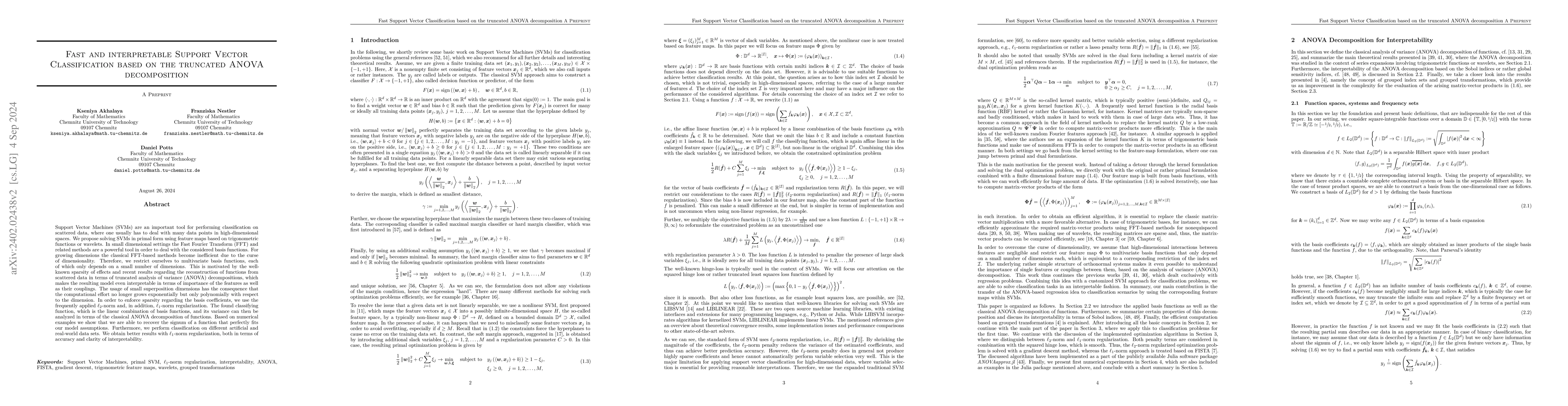 This paper proposes a fast and interpretable Support Vector Classification method using truncated ANOVA decomposition. It utilizes multivariate basis functions that depend on a small number of dimensions, avoiding the curse of dimensionality, and employs $\ell_2$-norm and $\ell_1$-norm regularization to enforce sparsity, achieving polynomial computational complexity and improved interpretability.