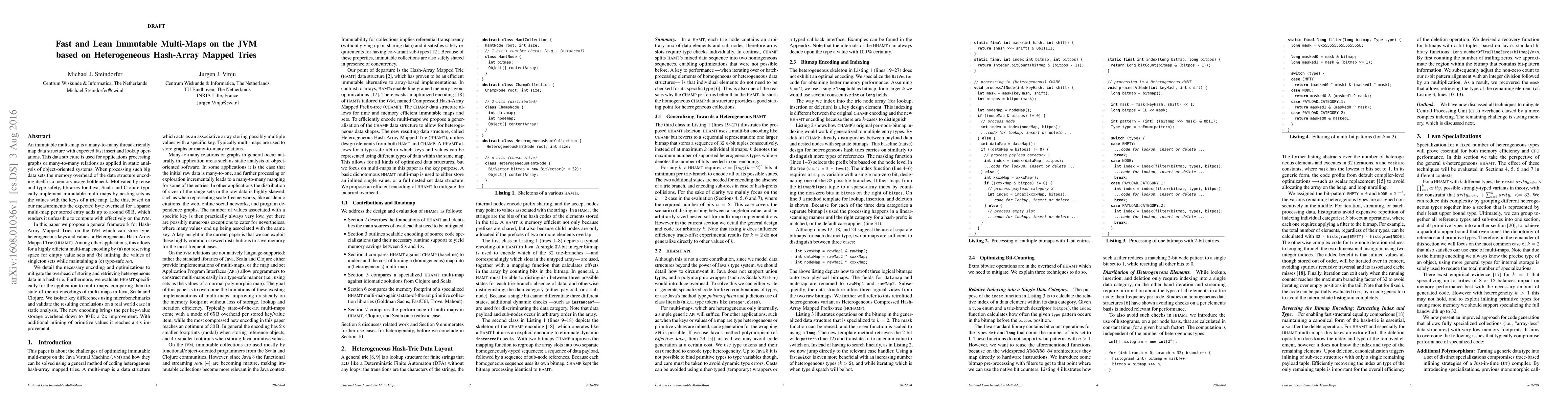 An immutable multi-map is a many-to-many thread-friendly map data structure with expected fast insert and lookup operations. This data structure is used for applications processing graphs or many-to-many relations as applied in static analysis of object-oriented systems. When processing such big data sets the memory overhead of the data structure encoding itself is a memory usage bottleneck. Motivated by reuse and type-safety, libraries for Java, Scala and Clojure typically implement immutable multi-maps by nesting sets as the values with the keys of a trie map. Like this, based on our measurements the expected byte overhead for a sparse multi-map per stored entry adds up to around 65B, which renders it unfeasible to compute with effectively on the JVM. In this paper we propose a general framework for Hash-Array Mapped Tries on the JVM which can store type-heterogeneous keys and values: a Heterogeneous Hash-Array Mapped Trie (HHAMT). Among other applications, this allows for a highly efficient multi-map encoding by (a) not reserving space for empty value sets and (b) inlining the values of singleton sets while maintaining a (c) type-safe API. We detail the necessary encoding and optimizations to mitigate the overhead of storing and retrieving heterogeneous data in a hash-trie. Furthermore, we evaluate HHAMT specifically for the application to multi-maps, comparing them to state-of-the-art encodings of multi-maps in Java, Scala and Clojure. We isolate key differences using microbenchmarks and validate the resulting conclusions on a real world case in static analysis. The new encoding brings the per key-value storage overhead down to 30B: a 2x improvement. With additional inlining of primitive values it reaches a 4x improvement.