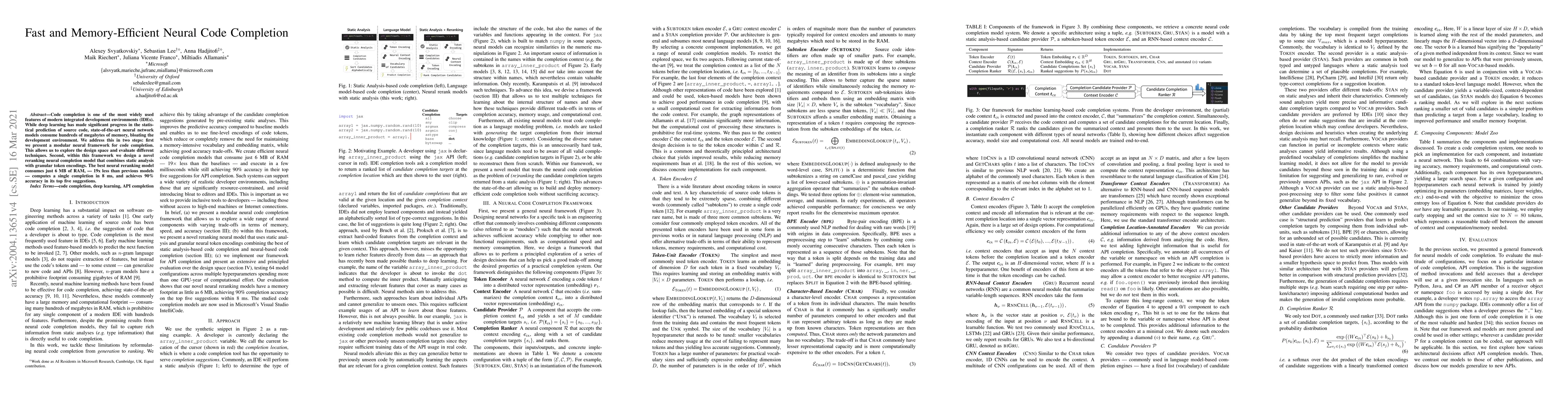 Code completion is one of the most widely used features of modern integrated development environments (IDEs). While deep learning has made significant progress in the statistical prediction of source code, state-of-the-art neural network models consume hundreds of megabytes of memory, bloating the development environment. We address this in two steps: first we present a modular neural framework for code completion. This allows us to explore the design space and evaluate different techniques. Second, within this framework we design a novel reranking neural completion model that combines static analysis with granular token encodings. The best neural reranking model consumes just 6 MB of RAM, - 19x less than previous models - computes a single completion in 8 ms, and achieves 90% accuracy in its top five suggestions.