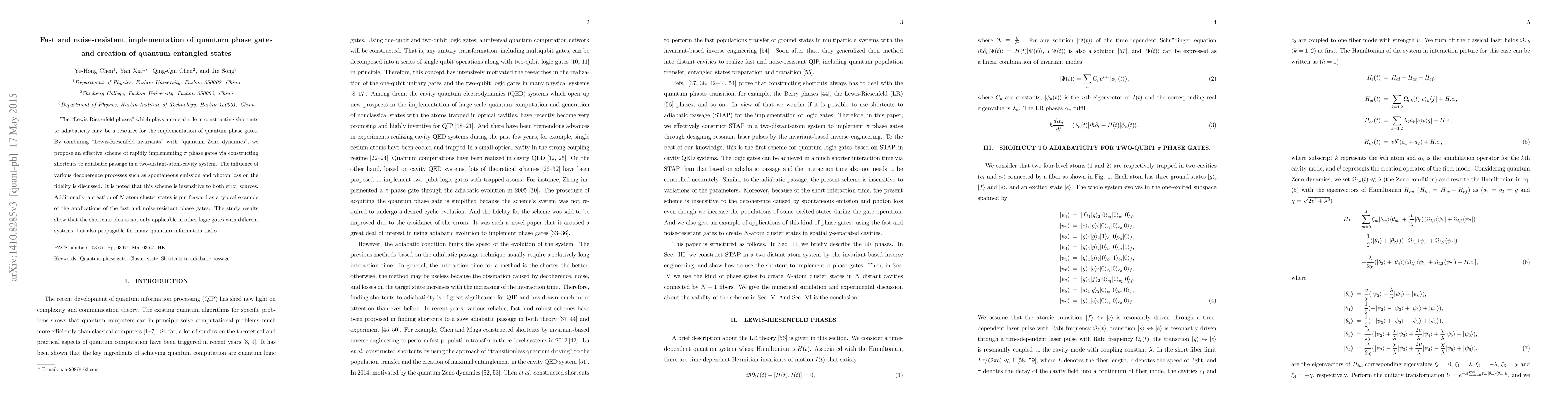 The "Lewis-Riesenfeld phases" which plays a crucial role in constructing shortcuts to adiabaticity may be a resource for the implementation of quantum phase gates. By combining "Lewis-Riesenfeld invariant" with "quantum Zeno dynamics", we propose an effective scheme of rapidly implementing $\pi$ phase gates via constructing shortcuts to adiabatic passage in a two-distant-atom-cavity system. The influence of various decoherence processes such as spontaneous emission and photon loss on the fidelity is discussed. It is noted that this scheme is insensitive to both two error sources. Additionally, a creation of N-atom cluster states is put forward as a typical example of the applications of the fast and noise-resistant phase gates. The study results show that the shortcuts idea is not only applicable in other logic gates with different systems, but also propagable for many quantum information tasks.