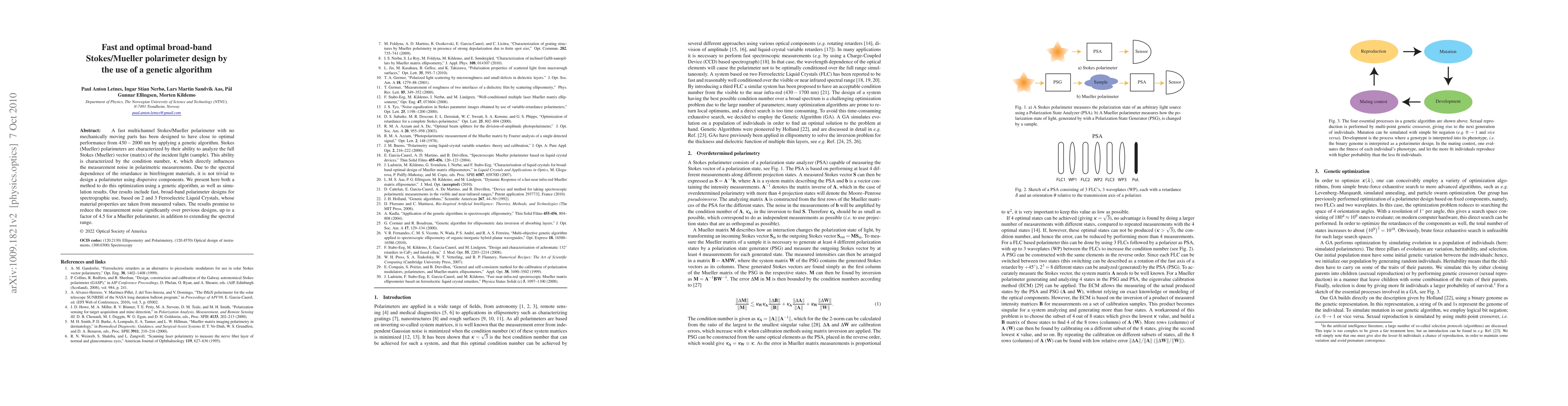 A fast multichannel Stokes/Mueller polarimeter with no mechanically moving parts has been designed to have close to optimal performance from 430-2000 nm by applying a genetic algorithm. Stokes (Mueller) polarimeters are characterized by their ability to analyze the full Stokes (Mueller) vector (matrix) of the incident light. This ability is characterized by the condition number, $\kappa$, which directly influences the measurement noise in polarimetric measurements. Due to the spectral dependence of the retardance in birefringent materials, it is not trivial to design a polarimeter using dispersive components. We present here both a method to do this optimization using a genetic algorithm, as well as simulation results. Our results include fast, broad-band polarimeter designs for spectrographic use, based on 2 and 3 Ferroelectric Liquid Crystals, whose material properties are taken from measured values. The results promise to reduce the measurement noise significantly over previous designs, up to a factor of 4.5 for a Mueller polarimeter, in addition to extending the spectral range.