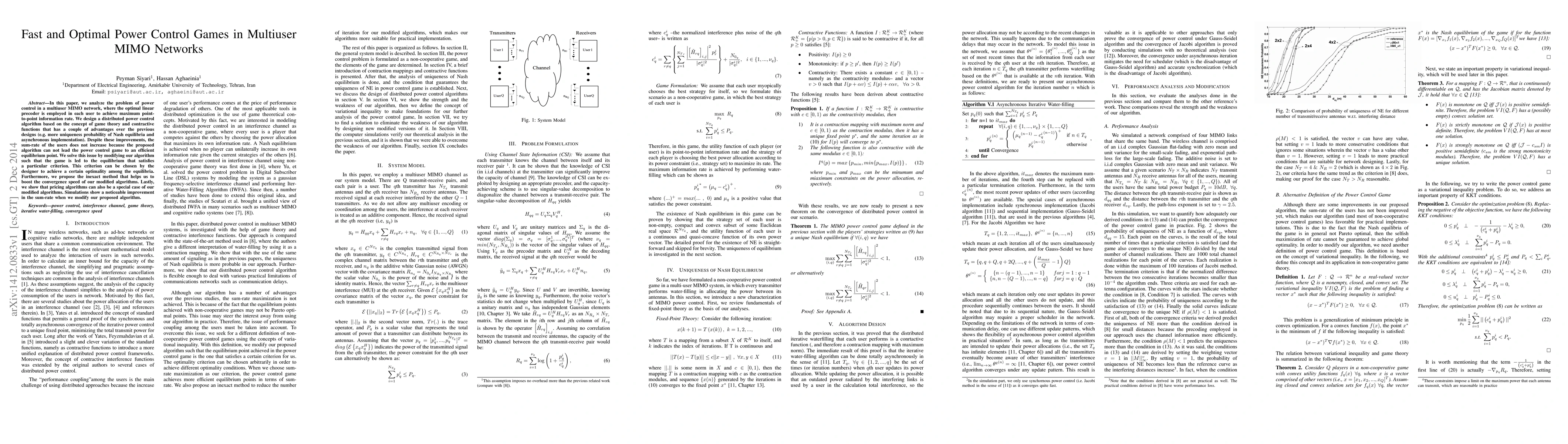 This paper proposes a distributed power control algorithm for multiuser MIMO networks using game theory and contractive functions, achieving better uniqueness and asynchronous capabilities. Despite initial limitations in achieving optimal sum-rate, the authors modify the algorithm to reach an equilibrium that meets a designer-defined optimality criterion, significantly improving sum-rate, as demonstrated by simulations.