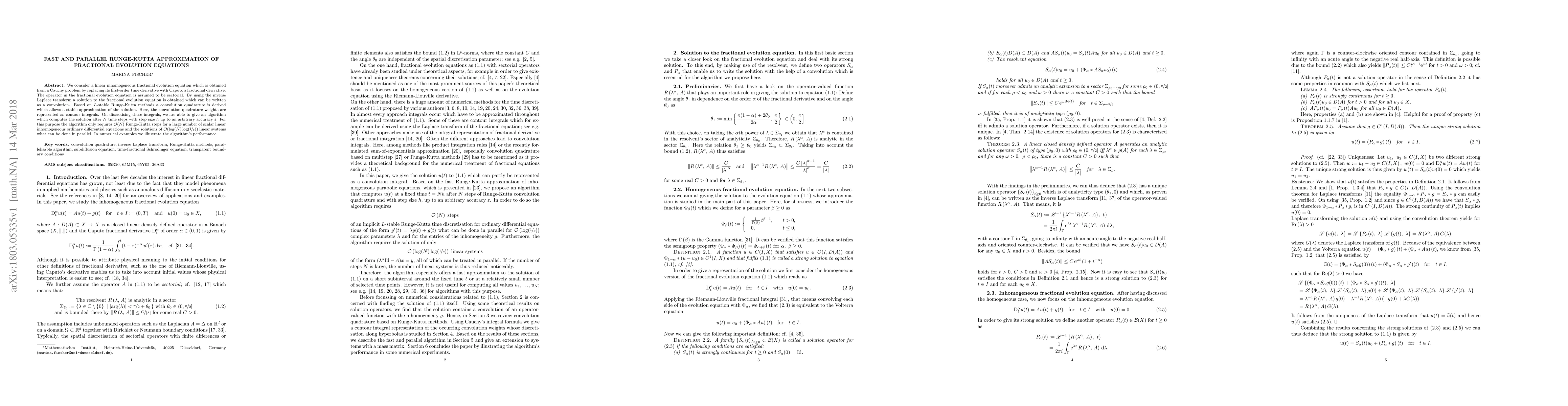 We consider a linear inhomogeneous fractional evolution equation which is obtained from a Cauchy problem by replacing its first-order time derivative with Caputo's fractional derivative. The operator in the fractional evolution equation is assumed to be sectorial. By using the inverse Laplace transform a solution to the fractional evolution equation is obtained which can be written as a convolution. Based on $L$-stable Runge-Kutta methods a convolution quadrature is derived which allows a stable approximation of the solution. Here, the convolution quadrature weights are represented as contour integrals. On discretising these integrals, we are able to give an algorithm which computes the solution after $N$ time steps with step size $h$ up to an arbitrary accuracy $\varepsilon$. For this purpose the algorithm only requires $\mathcal{O}(N)$ Runge-Kutta steps for a large number of scalar linear inhomogeneous ordinary differential equations and the solutions of $\mathcal{O}(\log(N)\log(\frac{1}{\varepsilon}))$ linear systems what can be done in parallel. In numerical examples we illustrate the algorithm's performance.