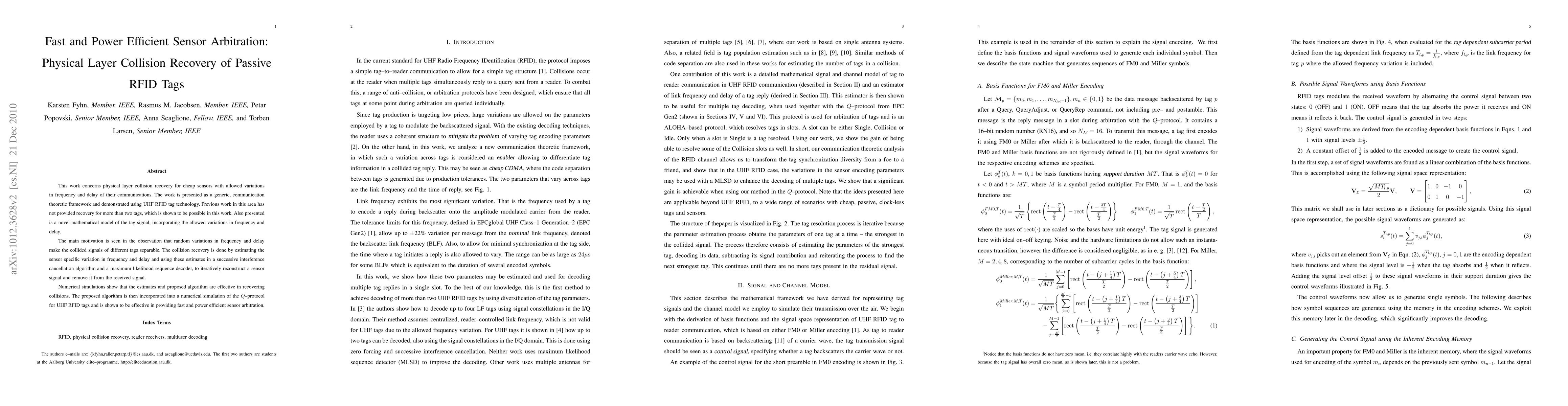 This paper presents a novel framework for physical layer collision recovery in passive RFID tags, utilizing variations in frequency and delay to separate collided signals. The proposed algorithm effectively estimates these variations and employs successive interference cancellation to reconstruct and remove individual sensor signals, demonstrating fast and power-efficient sensor arbitration.