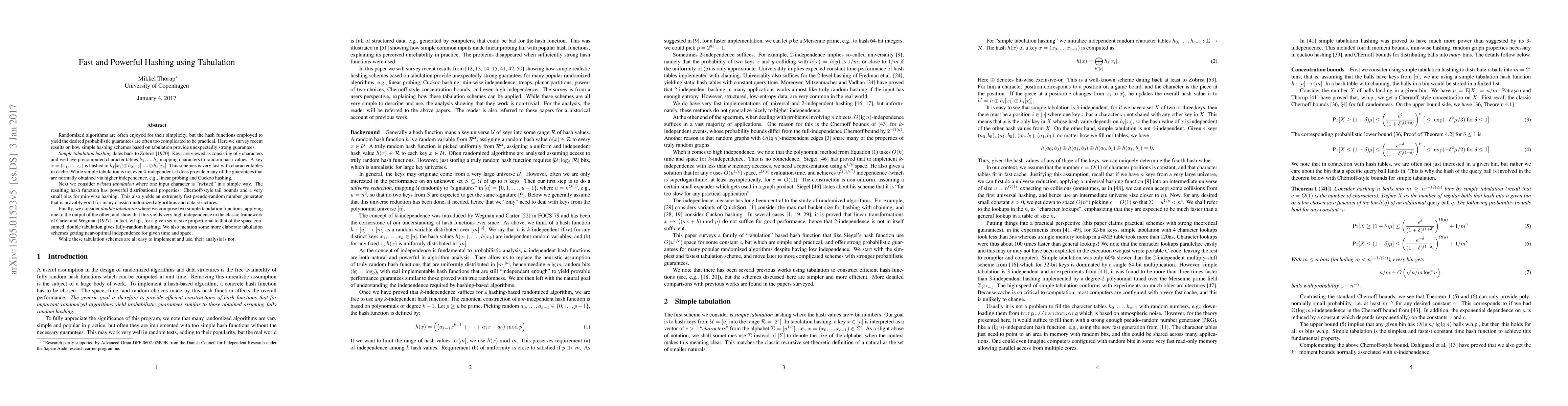 This paper surveys recent advancements in hashing techniques based on tabulation, demonstrating that simple yet effective tabulation hashing schemes can provide strong probabilistic guarantees comparable to more complex methods. The paper explores variations like twisted and double tabulation to achieve powerful distributional properties and high independence, making them practical for fast and efficient randomized algorithms.