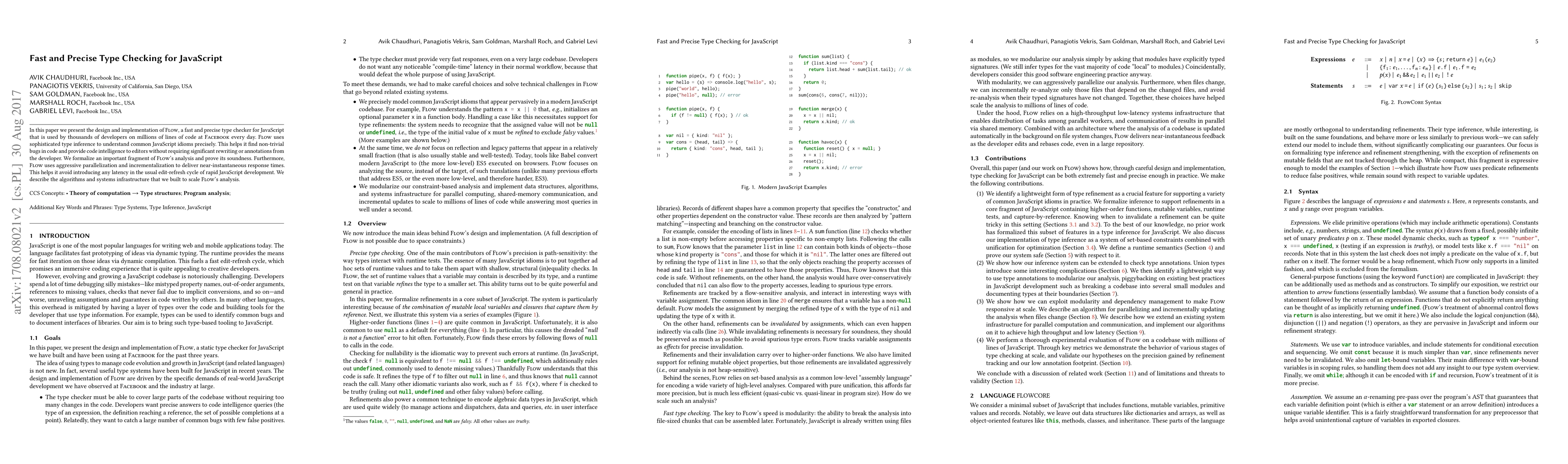 This paper introduces Flow, a fast and precise type checker for JavaScript that leverages sophisticated type inference and parallelization to detect bugs and provide code intelligence without requiring extensive developer annotations. The authors also prove the soundness of an important fragment of Flow's analysis and describe the infrastructure that enables its scalability.