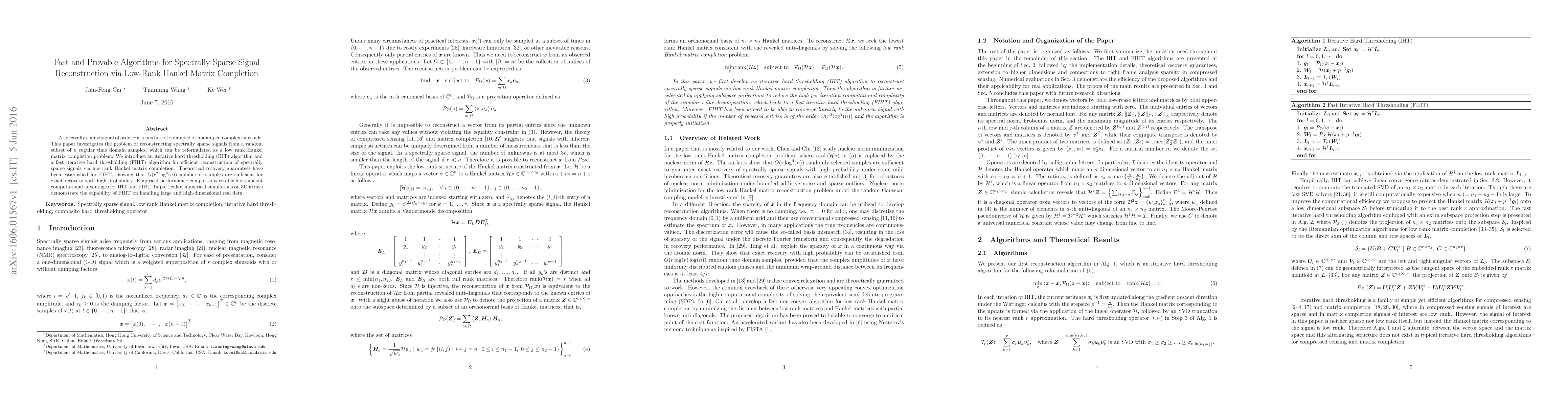 This paper proposes efficient algorithms for reconstructing spectrally sparse signals from a limited number of samples by completing low-rank Hankel matrices. It introduces iterative hard thresholding and fast iterative hard thresholding methods, with theoretical guarantees showing that $O(r^2\log^2(n))$ samples suffice for accurate recovery, and demonstrates significant computational benefits in simulations.