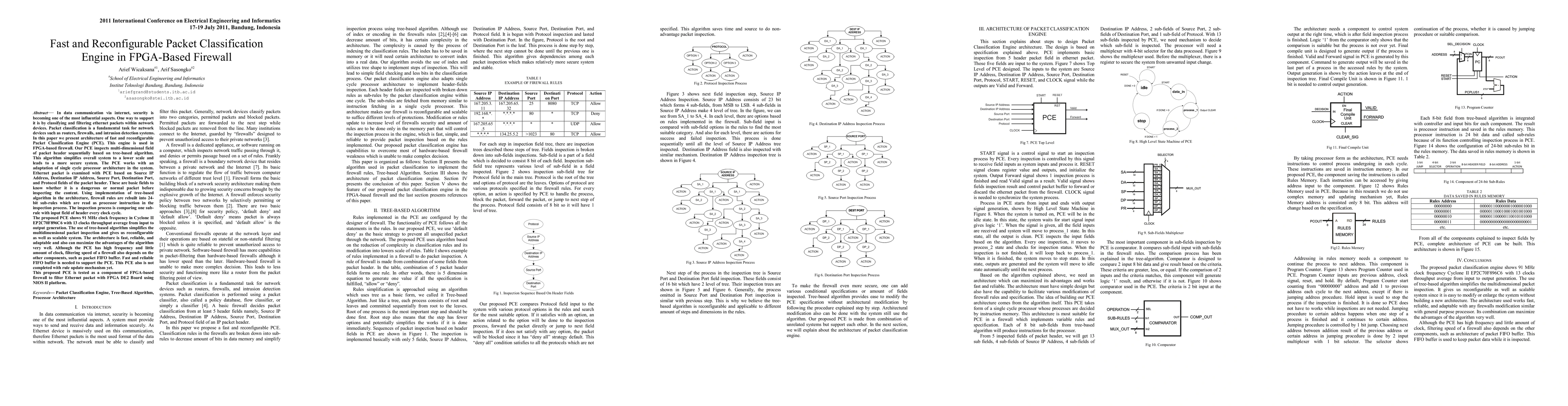 This paper presents a fast and reconfigurable Packet Classification Engine (PCE) for FPGA-based firewalls, utilizing a tree-based algorithm to inspect Ethernet packets based on IP and port fields. The PCE achieves high throughput and frequency, but its performance depends on the supporting FIFO buffer and lacks a complete rule update mechanism.